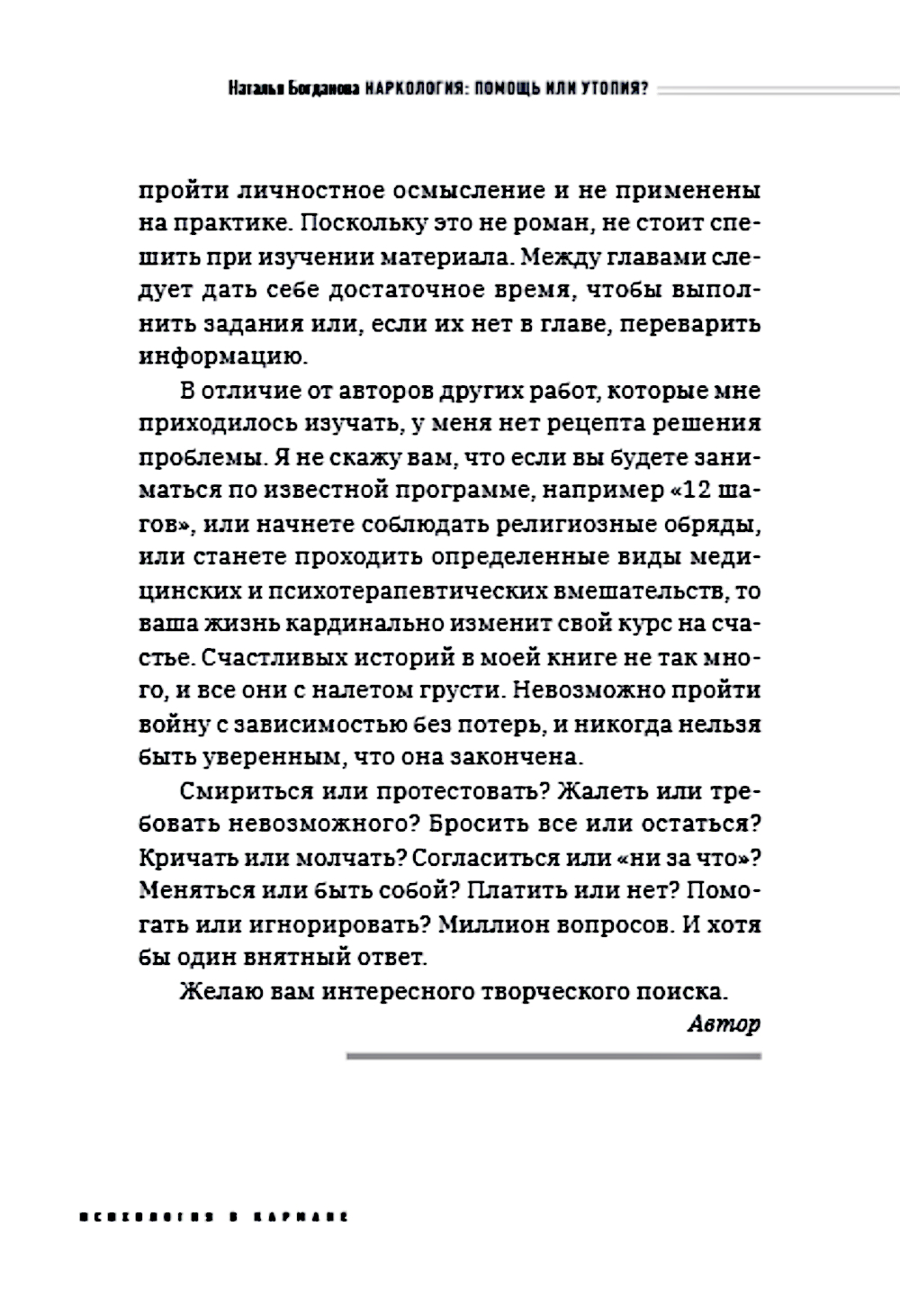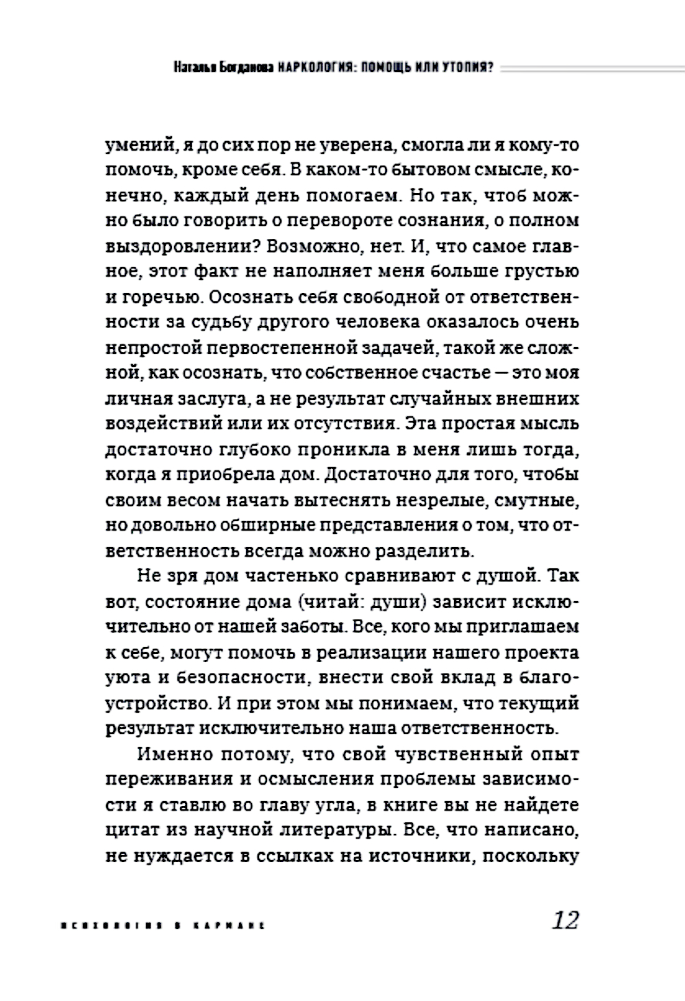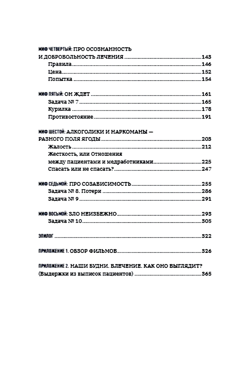Правдивые истории о том, как глубоки и устойчивы неправильные представления о природе зависимости у большей части людей, включая самих зависимых, их родственников и медработников. Как сложно и мучительно обретать это понимание при попытках оказания помощи зависимым. Насколько непримирима, неэффективна и драматична борьба ценностей зависимых и здоровых. Книга о том, что существующее мироустройство безнадежно в плане надежд на освобождение человечества от пут зависимости. Бороться с кем, чем, зачем и как - вечные вопросы; они сродни экзистенциальным, которые волнуют любого столкнувшегося с проблемой зависимости не понаслышке. Истории из практики, описание особенностей работы наркологического стационара, яркие запомнившиеся ситуации, размышления о полученном опыте и, в сущности, банальный, но всегда неочевидный ответ: изменить простому смертному дано только себя и свою жизнь. Книга рассказывает о том, что сокрыто за стенами больницы. Как проходит лечение зависимых, какие цели преследуют пациенты, соглашаясь на госпитализацию, с какими трудностями приходится сталкиваться медицинским работникам при оказании помощи наркоманам и алкоголикам. Автор размышляет над вопросами, ответы на которые совсем не очевидны. Могут ли родственники и близкие больных влиять на результат лечения? Где находятся границы помощи? Чья обреченность драматичней: зависимого или его близкого? Не эфемерны ли надежды на выздоровление? Где черпать силы, чтобы продолжать жить? Книга побуждает к раздумьям и поискам, полемизирует с официальными подходами, дает необходимую поддержку страдающим близким и родственникам пациентов в любых принимаемых ими решениях. Книга адресована людям, личные и профессиональные судьбы которых переплетены с жизненными путями зависимых.