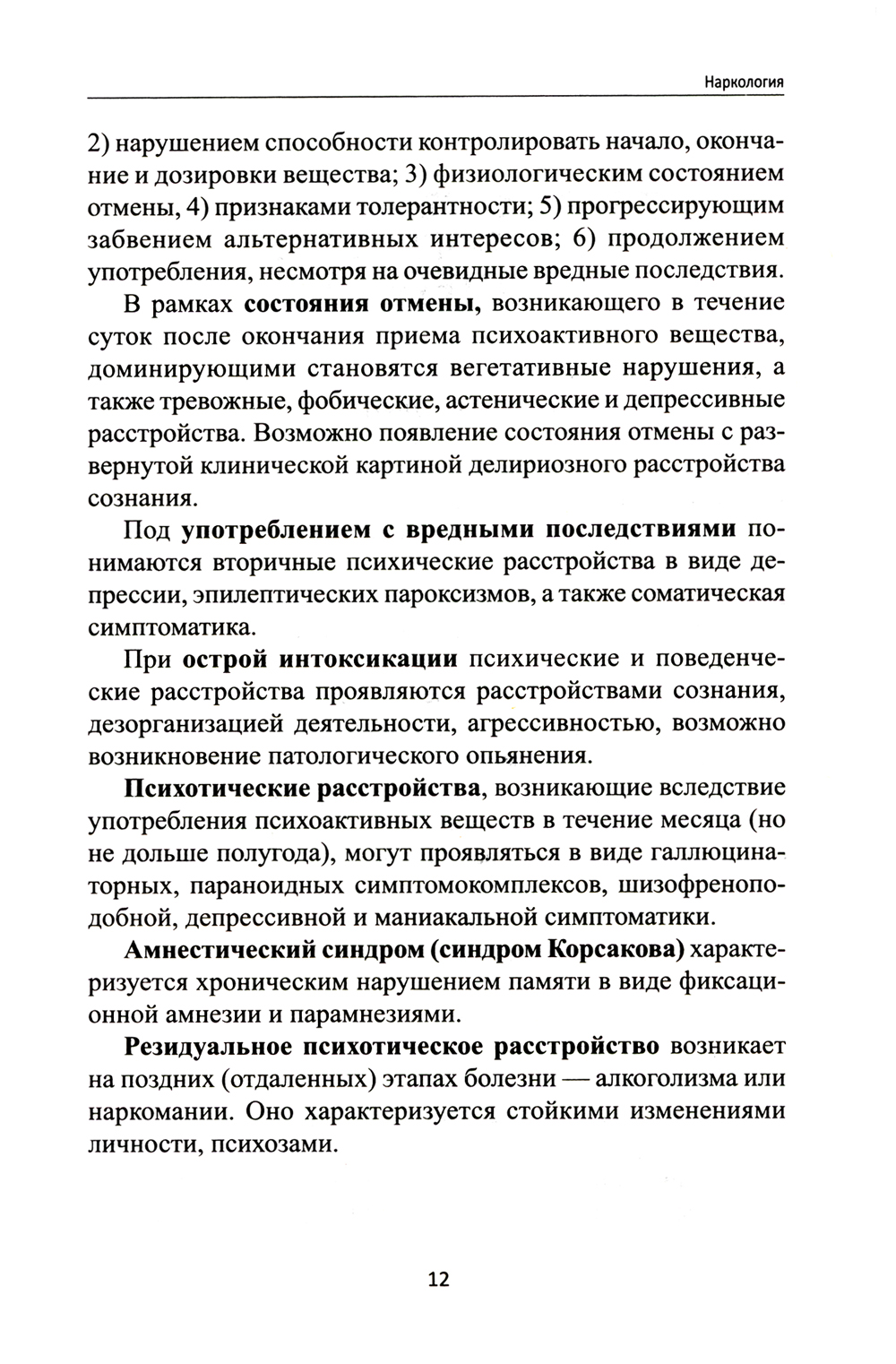 В учебнике отражены основные разделы наркологии. Подробно описана наркологическая семиотика и феноменология аддиктивных (наркологических) расстройств. В соответствии с МКБ-10 приведены описания наркологических расстройств в результате употребления различных психоактивных веществ. Учебник содержит главы, посвященные алкогольной, опиоидной, никотиновой и другим зависимостям, в которых приводятся данные об эпидемиологии, этиопатогенезе, клинике и терапии. Учебник предназначен для студентов высших медицинских заведений.| Издательство | Феникс |