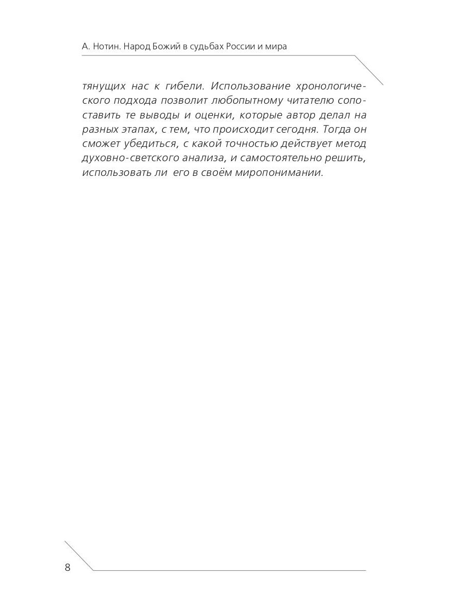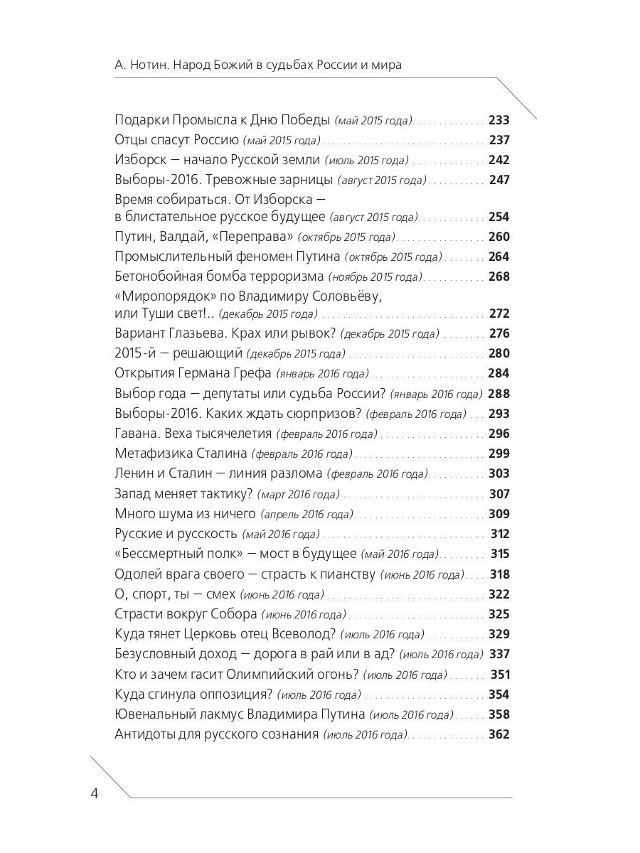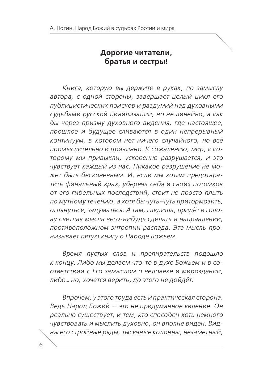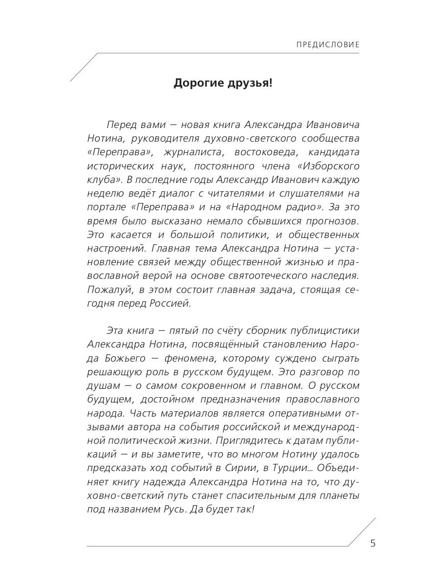 Перед вами - новая книга Александра Ивановича Нотина, руководителя духовно-светского сообщества «Переправа», журналиста, востоковеда, кандидата исторических наук, постоянного члена «Изборского клуба». В последние годы Александр Иванович каждую неделю ведёт диалог с читателями и слушателями на портале «Переправа» и на «Народном радио». За это время было высказано немало сбывшихся прогнозов. Это касается и большой политики, и общественных настроений. Главная тема Александра Нотина - установление связей между общественной жизнью и православной верой на основе святоотеческого наследия. Пожалуй, в этом состоит главная задача, стоящая сегодня перед Россией. Эта книга - пятый по счёту сборник публицистики Александра Нотина, посвященный становлению Народа Божьего - феномена, которому суждено сыграть решающую роль в русском будущем. Это разговор по душам - о самом сокровенном и главном. О русском будущем, достойном предназначения православного народа. Часть материалов является оперативными отзывами автора на события российской и международной политической жизни. Приглядитесь к датам публикаций - и вы заметите, что во многом Нотину удалось предсказать ход событий в Сирии, в Турции... Объединяет книгу надежда Александра Нотина на то, что духовно-светский путь станет спасительным для планеты под названием Русь. Да будет так!| Издательство | Т8 RUGRAM |