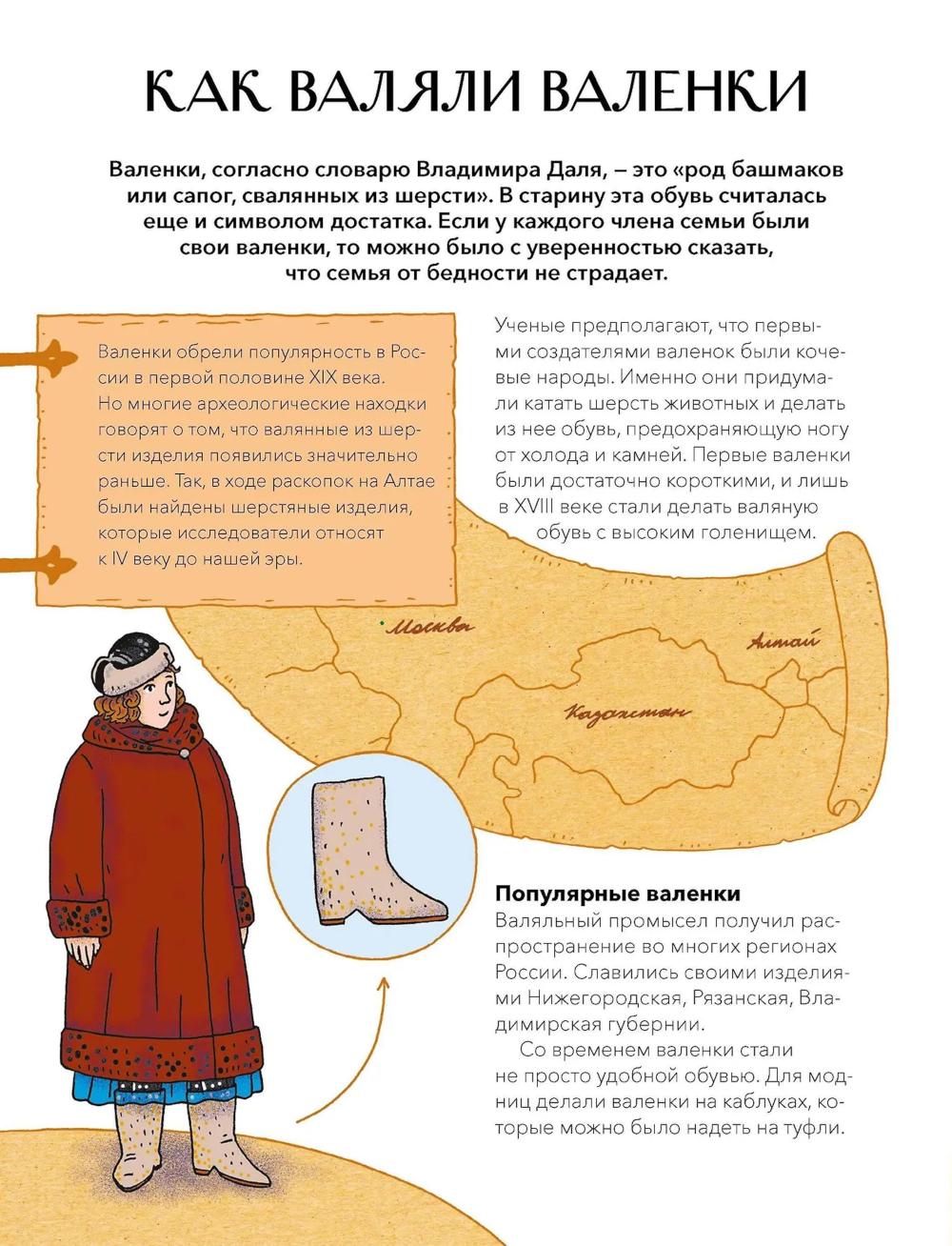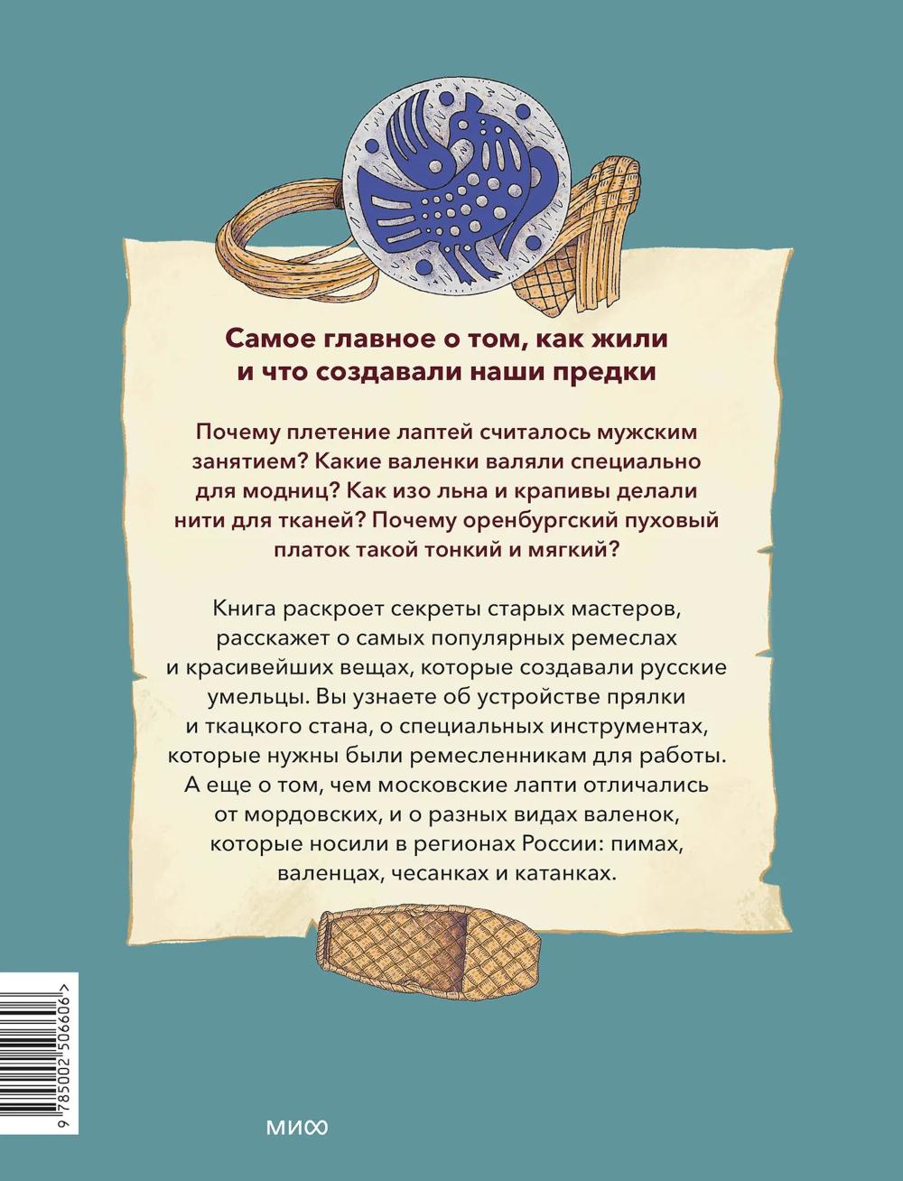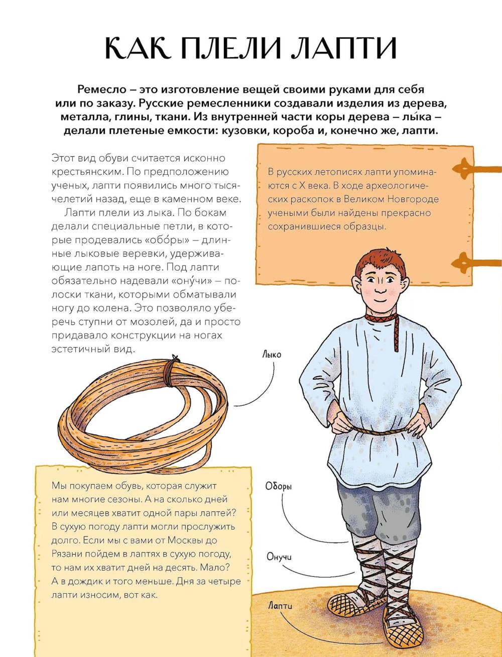 Книга из серии «Наша страна Россия. Как жили на Руси», в которой собраны небольшие красочные издания по 16 страниц, созданные специально для первого чтения и занятий с детьми. Простые тексты, написанные историками и этнографами, и яркие иллюстрации помогут ребенку увидеть, как жили наши предки, научат бережно относиться к истории и ценить традиции своей страны. Почему плетение лаптей считалось мужским занятием? Какие валенки валяли специально для модниц? Как из льна и крапивы делали нити для тканей? Почему оренбургский пуховый платок такой тонкий и мягкий? Книга раскроет секреты старых мастеров, расскажет о самых популярных ремеслах и красивейших вещах, которые создавали русские умельцы. Вы узнаете об устройстве прялки и ткацкого стана, о специальных инструментах, которые нужны были ремесленникам для работы. А еще о том, чем московские лапти отличались от мордовских, и о разных видах валенок, которые носили в регионах России: пимах, валенцах, чесанках и катанках.| Издательство | Манн, Иванов и Фербер |
