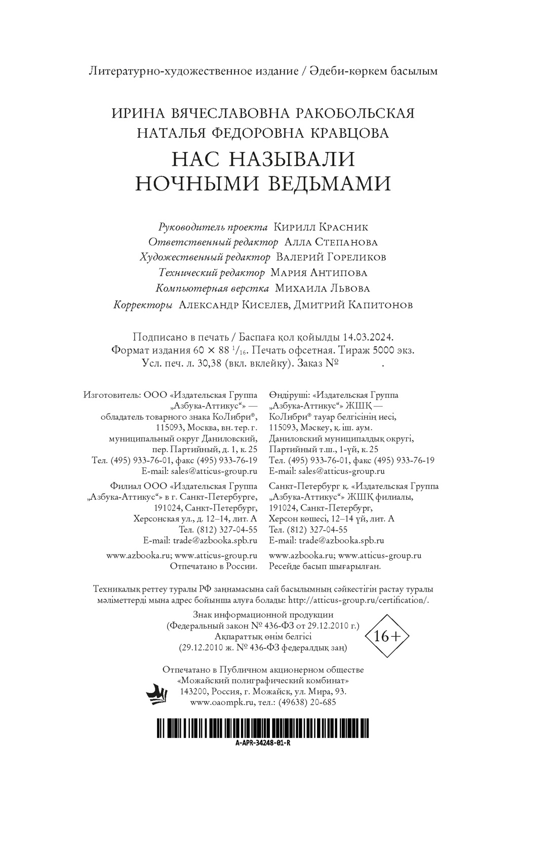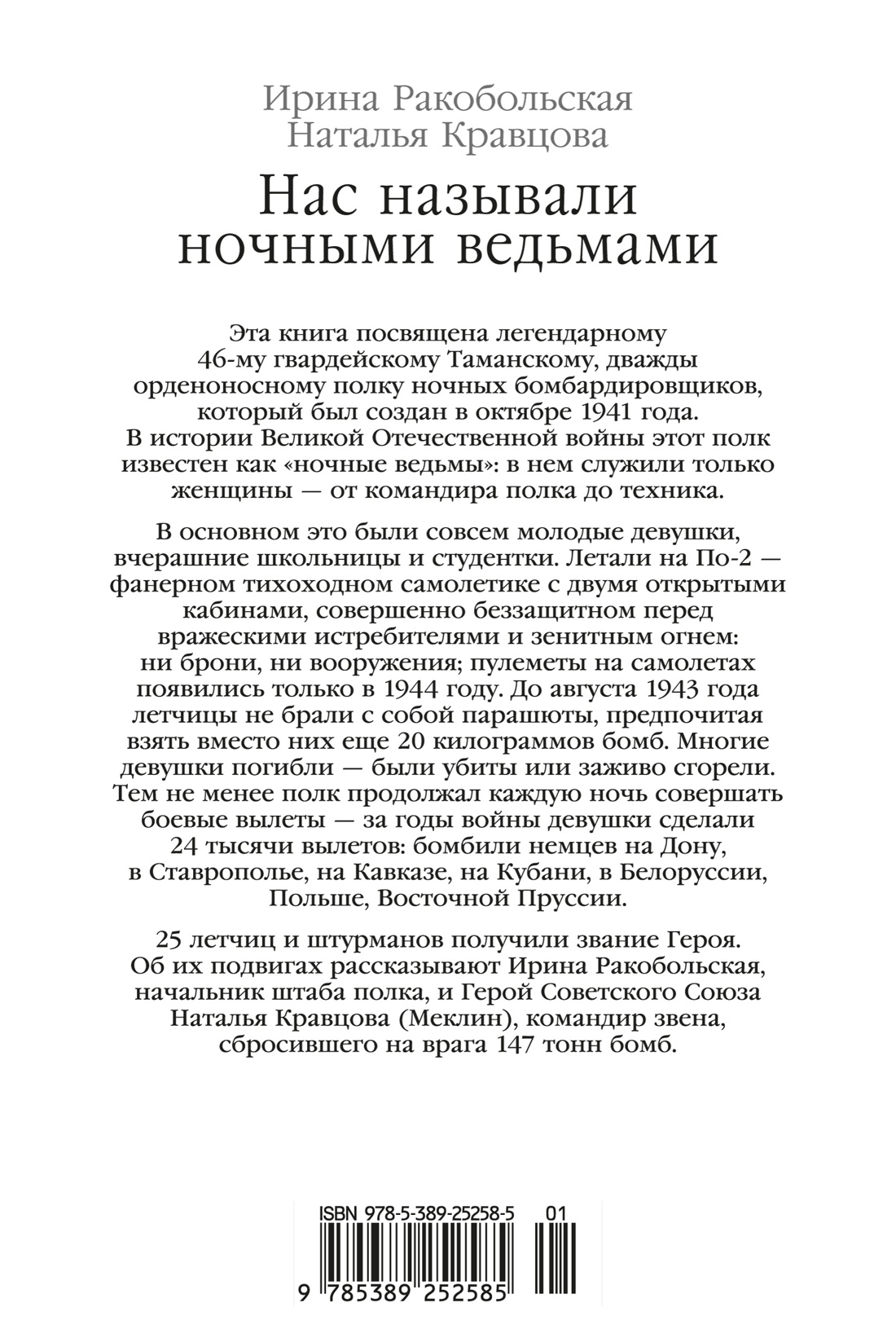 Эта книга посвящена легендарному 46-му гвардейскому Таманскому, дважды орденоносному полку ночных бомбардировщиков, который был создан в октябре 1941 года. В истории Великой Отечественной войны этот полк известен как «ночные ведьмы»: в нем служили только женщины - от командира полка до техника. В основном это были совсем молодые девушки, вчерашние школьницы и студентки. За годы войны девушки сделали 24 тысячи боевых вылетов: бомбили немцев на Дону, в Ставрополье, на Кавказе, на Кубани, в Белоруссии, Польше, Восточной Пруссии. 25 летчиц и штурманов получили звание Героя. Об их подвигах рассказывают Ирина Ракобольская, начальник штаба полка, и Герой Советского Союза Наталья Кравцова (Меклин), командир звена, сбросившего на врага 147 тонн бомб.| Издательство | КоЛибри |