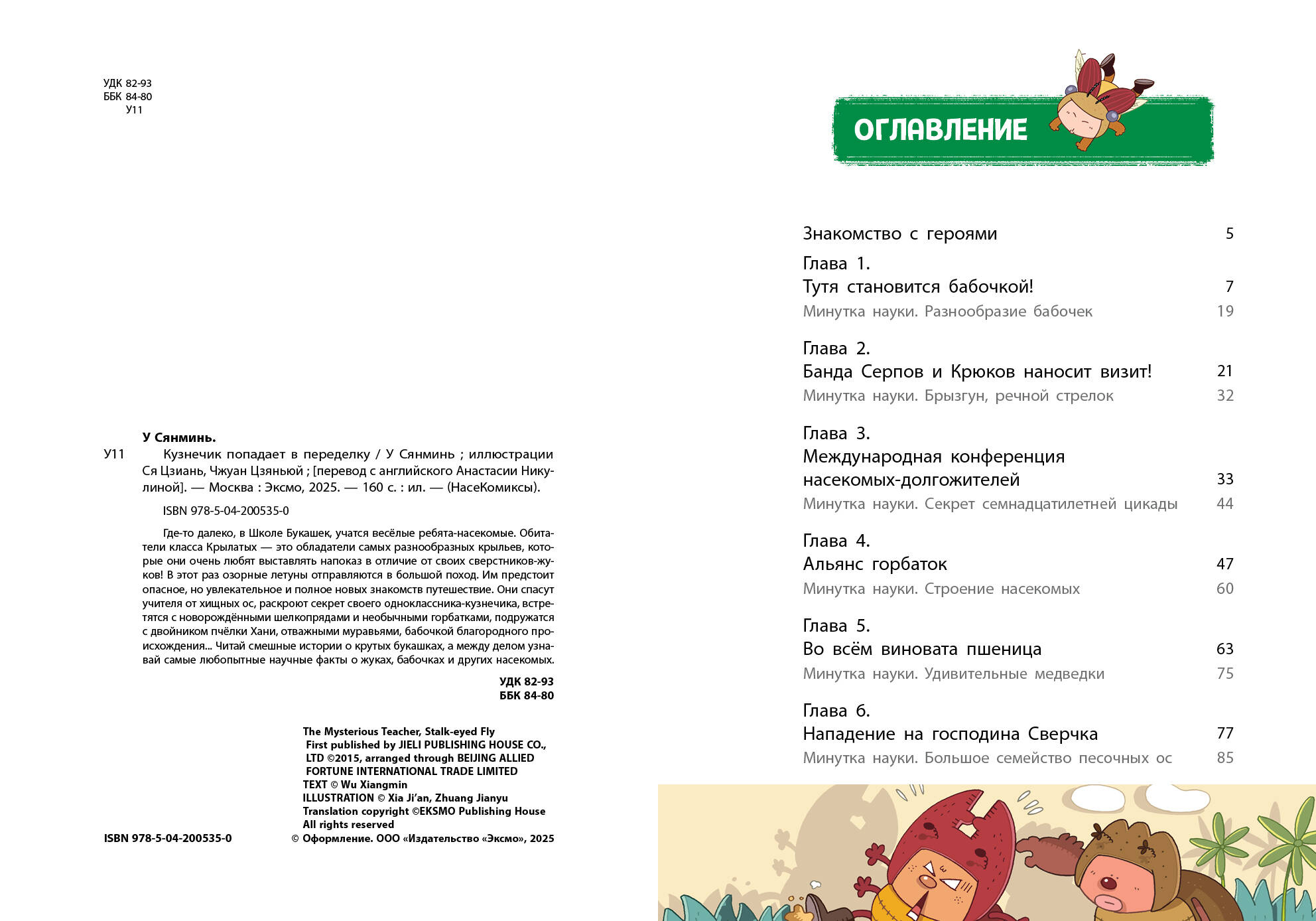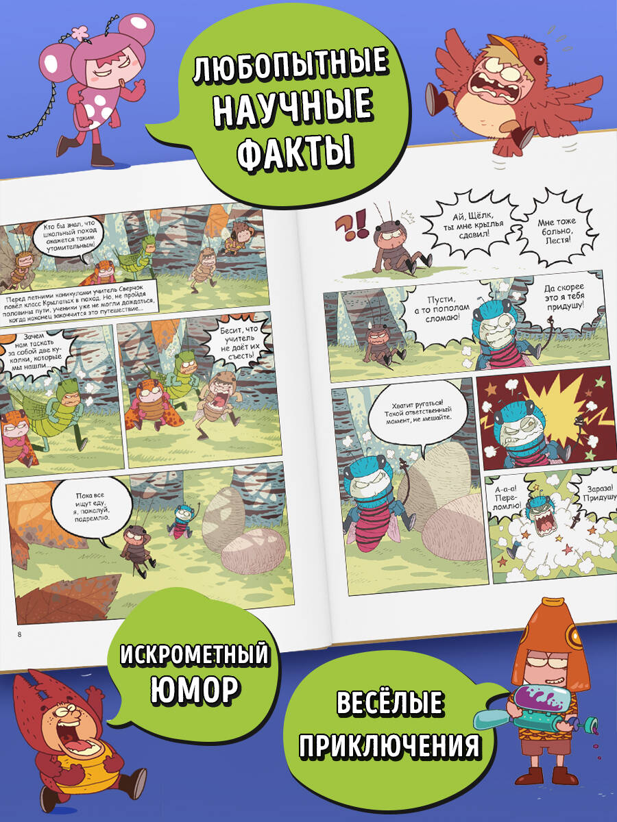 Долгожданное продолжение серии познавательных комиксов о насекомых! Герои комикса - совсем как настоящие дети: ходят в школу, дружат, попадают в переделки, но… все они - НАСЕКОМЫЕ! Скорее открывай книгу про насекомых и узнай, как озорные ученики класса Крылатых отправились в большой поход! Им предстоит опасное, но увлекательное путешествие. Ребята спасут учителя от хищных ос, раскроют секрет своего одноклассника-кузнечика, встретятся с удивительными насекомыми-долгожителями, подружатся с двойником пчёлки Хани, отважными муравьями и даже бабочкой благородного происхождения... Присоединяйся к приключениям крутых букашек, читай о них смешные истории в формате красочного комикса - и одновременно узнавай самые любопытные научные факты о жуках, бабочках и других насекомых! В конце каждой главы этой веселой энциклопедии про насекомых тебя ждут познавательные страницы о жизни и устройстве этих удивительных существ! Книги серии стали бестселлером в странах Азии и были включены в «Топ-100 книг, рекомендованных к прочтению подросткам»! «НасеКомиксы» - лучший подарок по любому поводу!| Издательство | ООО "Издательство "Эксмо" |