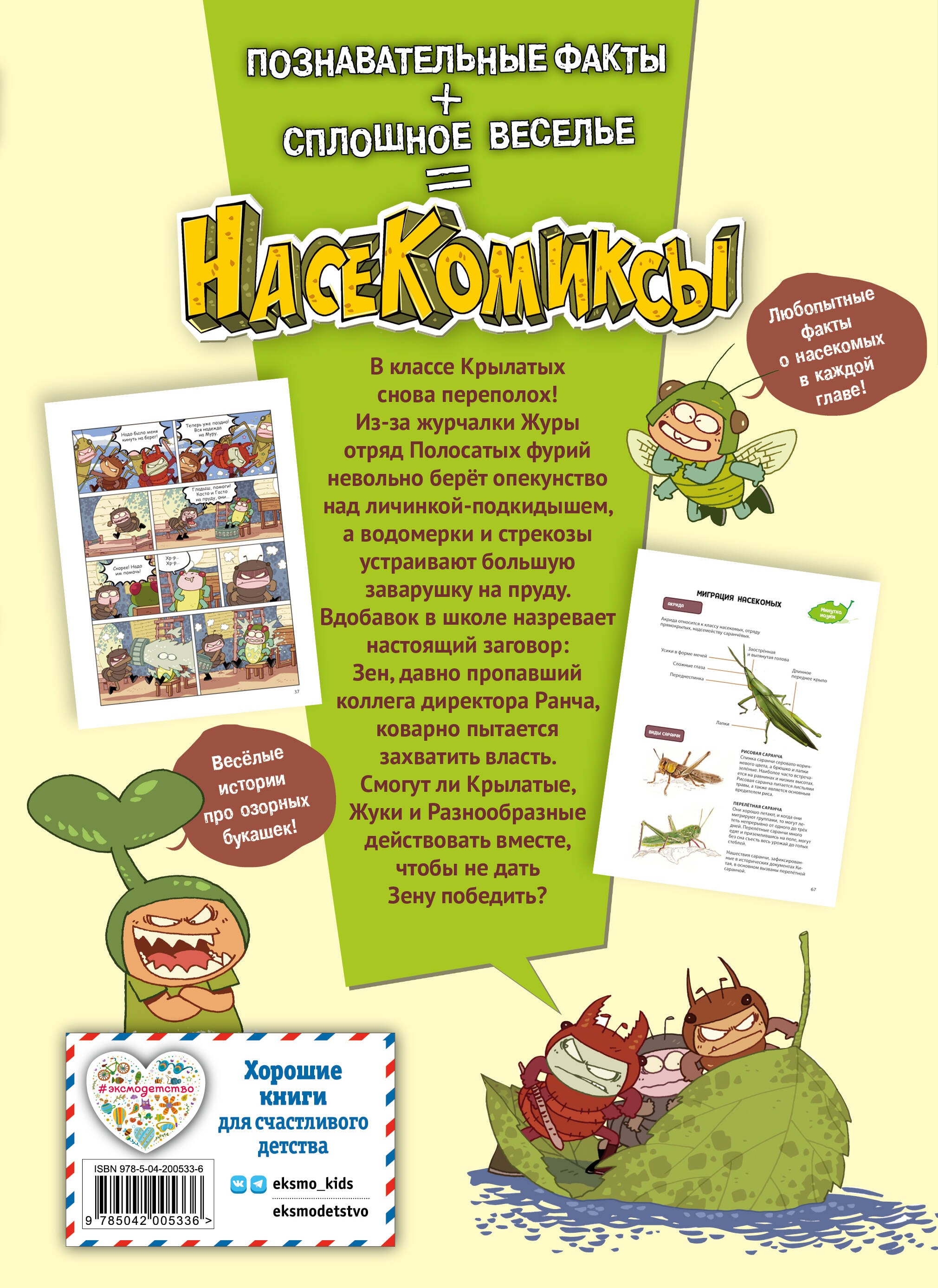 Долгожданное продолжение серии познавательных комиксов о насекомых! Герои комикса - совсем как настоящие дети: ходят в школу, дружат, попадают в переделки, но… все они - НАСЕКОМЫЕ! Скорее открывай книгу про насекомых и узнай, кто виноват в загадочном происшествии в пчелином улье, из-за чего в Школе Букашек назрел заговор по смещению директора с должности, как из-за троих маленьких муравьев произошло столкновение между стрекозами и водомерками и многое другое! Присоединяйся к приключениям крутых букашек, читай о них смешные истории в формате красочного комикса - и одновременно узнавай самые любопытные научные факты о жуках, бабочках и других насекомых! В конце каждой главы этой веселой энциклопедии про насекомых тебя ждут познавательные страницы о жизни и устройстве этих удивительных существ! Книги серии стали бестселлером в странах Азии и были включены в «Топ-100 книг, рекомендованных к прочтению подросткам»! «НасеКомиксы» - лучший подарок по любому поводу!| Издательство | ООО "Издательство "Эксмо" |