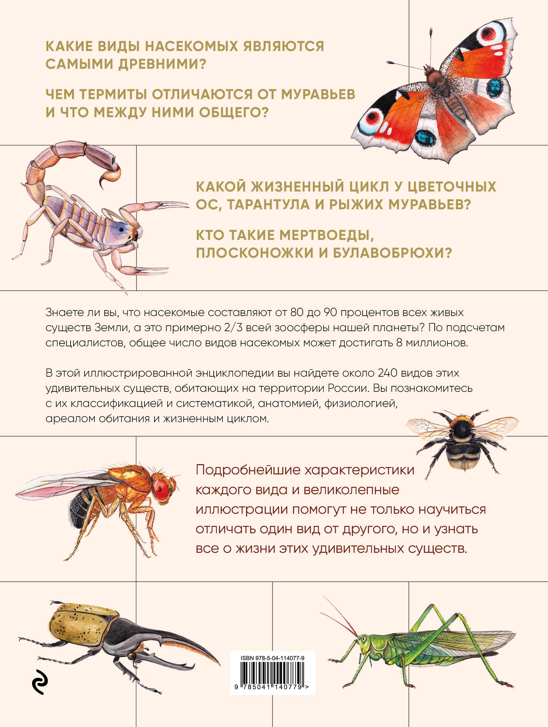 Знаете ли вы, что насекомые составляют от 80 до 90 процентов общего количества живых существ Земли, а это примерно 2/3 всей зоосферы нашей планеты? По подсчетам специалистов, общее число видов насекомых может достигать 8 миллионов. В этой иллюстрированной энциклопедии вы найдете 240 видов этих удивительных существ, обитающих на территории России. Вы познакомитесь с их классификацией и систематикой, анатомией, физиологией, ареалом обитания и жизненным циклом. Подробнейшие характеристики каждого вида и великолепные иллюстрации помогут не только научиться отличать один вид от другого, но и узнать все об их жизни.| Издательство | ООО "Издательство "Эксмо" |