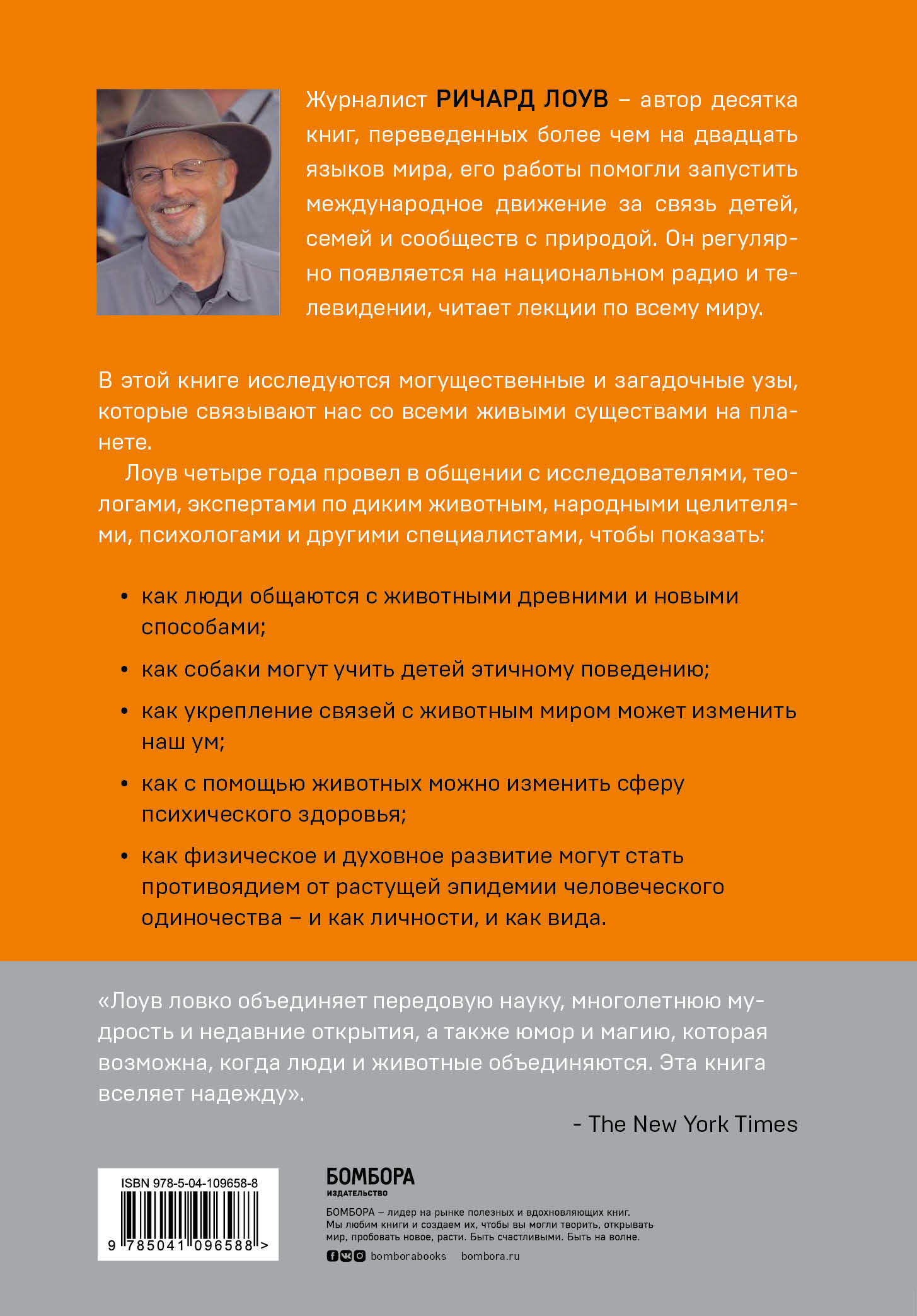 Сейчас, когда многие живут в городских условиях, нам как никогда необходимо единение с природой и общение с животными. Книга журналиста и автора десятка работ, переведенных на 20 языков, заставит отвлечься от мониторов и экранов гаджетов, которые доминируют в нашей реальности, и вспомнить, что мы - часть природы и наша связь с животным миром может изменить нашу ментальную, физическую и духовную жизнь. Эта книга - призыв к воссоединению с природой и животными, которое может стать настоящим лекарством от многих проблем современной жизни, включая одиночество и скуку. Автор исследует эти могущественные и загадочные связи из прошлого, рассказывает о том, как они могут служить противоядием от растущей эпидемии человеческого одиночества и помочь нам проявить сочувствие, необходимое для сохранения жизни на Земле. Лоув берет интервью у исследователей, теологов, экспертов по дикой природе, местных целителей и психологов, чтобы показать, как люди общаются с животными древними и новыми способами; как собаки могут научить детей этичному поведению; как терапия с использованием животных может изменить сферу психического здоровья; какую роль отношения человека и животного играют в нашем духовном здоровье. Ричард Лоув - американский автор научных работ и журналист. Его книги, переведенные на 20 языков, помогли запустить международное движение за соединение детей, семьи и общества с природой. Он регулярно читает лекции по всему миру. Лоув ловко объединяет передовую науку, многолетнюю мудрость и недавние открытия, а также чудеса и юмор, никогда не упуская из виду магию, которая возможна при воссоединении человека с животным миром.| Издательство | ООО "Издательство "Эксмо" |