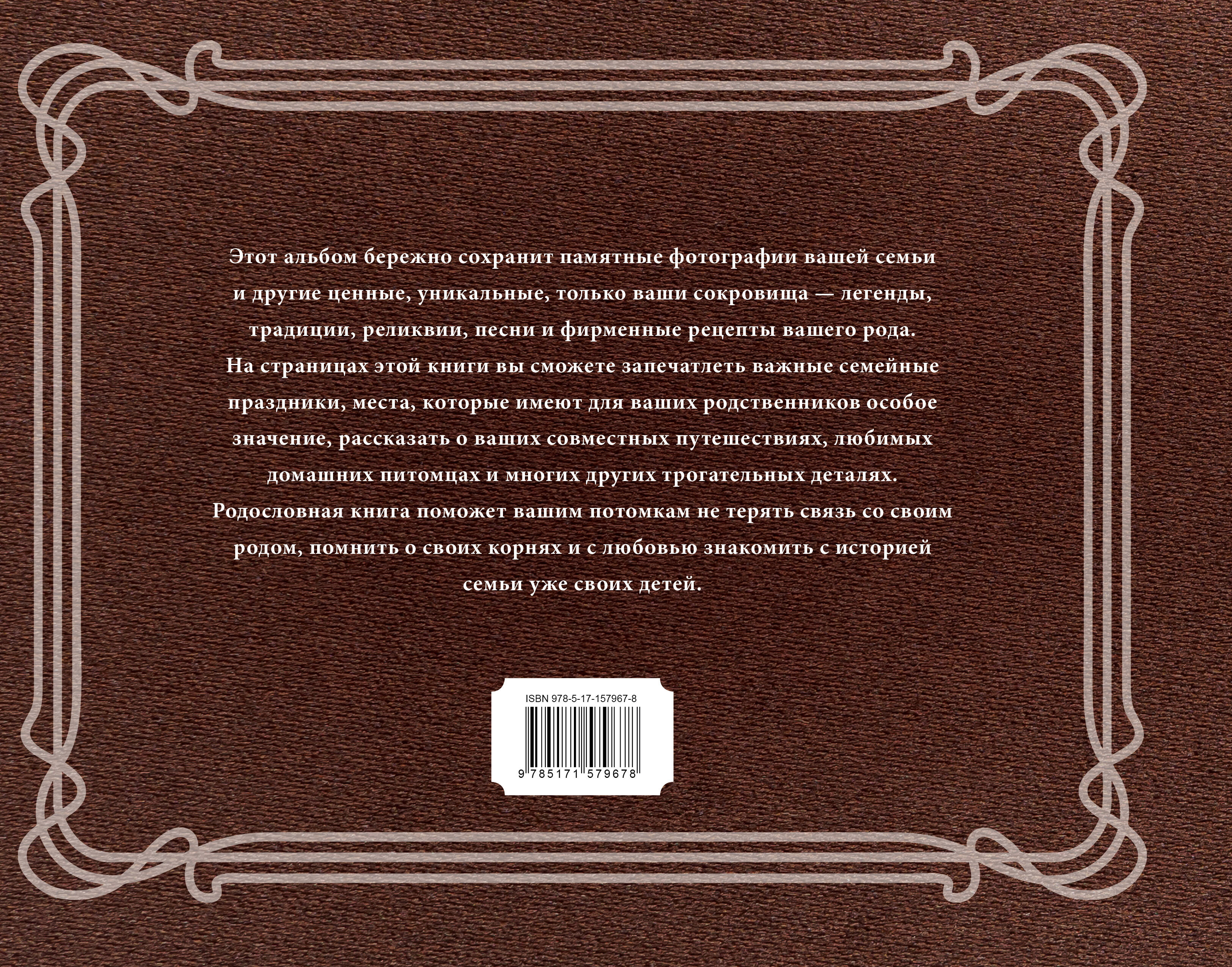 Этот альбом бережно сохранит памятные фотографии вашей семьи и другие ценные, уникальные, только ваши сокровища - легенды, традиции, реликвии, песни и фирменные рецепты вашего рода. На страницах этой книги вы сможете запечатлеть важные семейные праздники, места, которые имеют для ваших родственников особое значение, рассказать о ваших совместных путешествиях, любимых домашних питомцах и многих других трогательных деталях. Родословная книга поможет вашим потомкам не терять связь со своим родом, помнить о своих корнях и с любовью знакомить с историей семьи уже своих детей.| Издательство | Издательство "АСТ" |