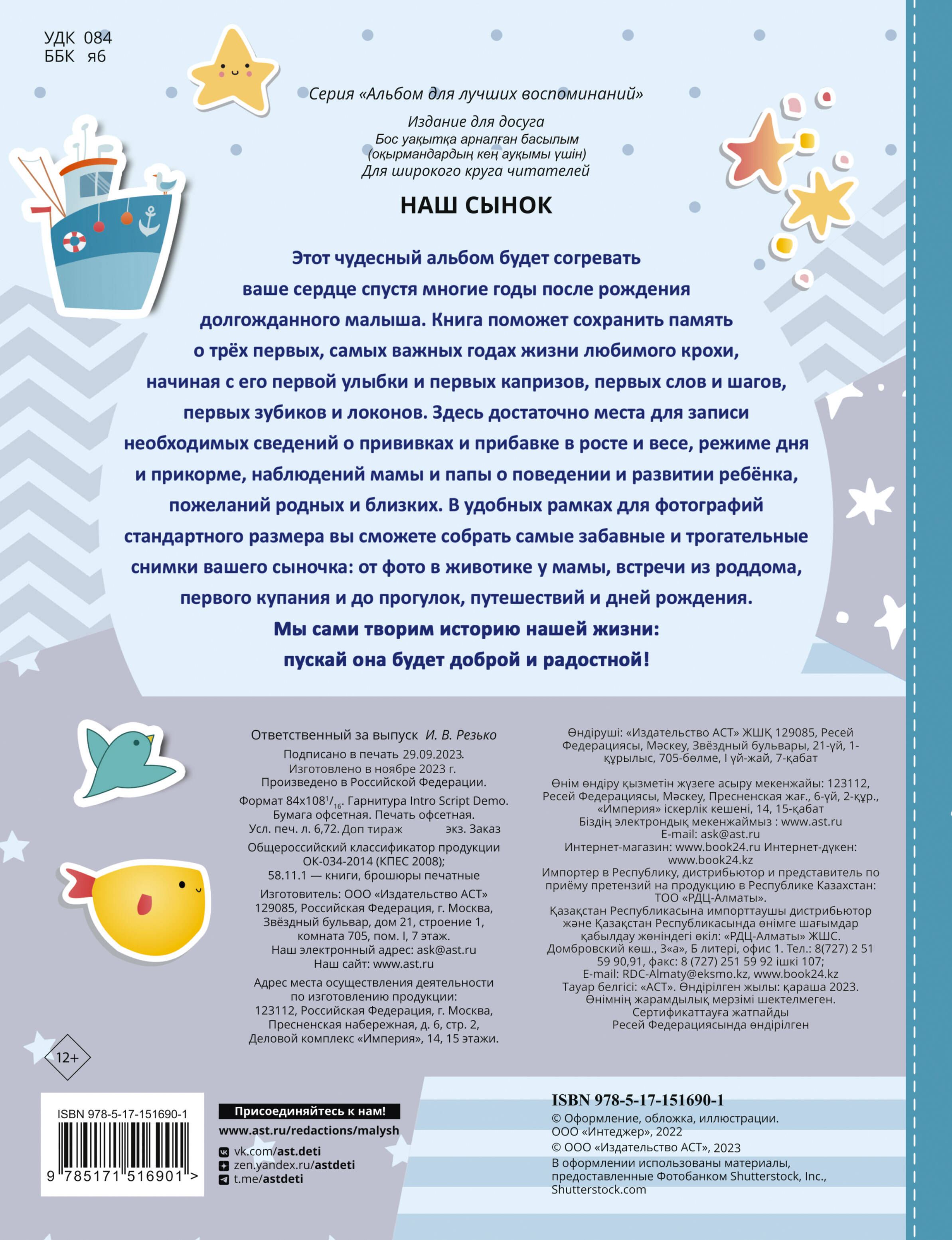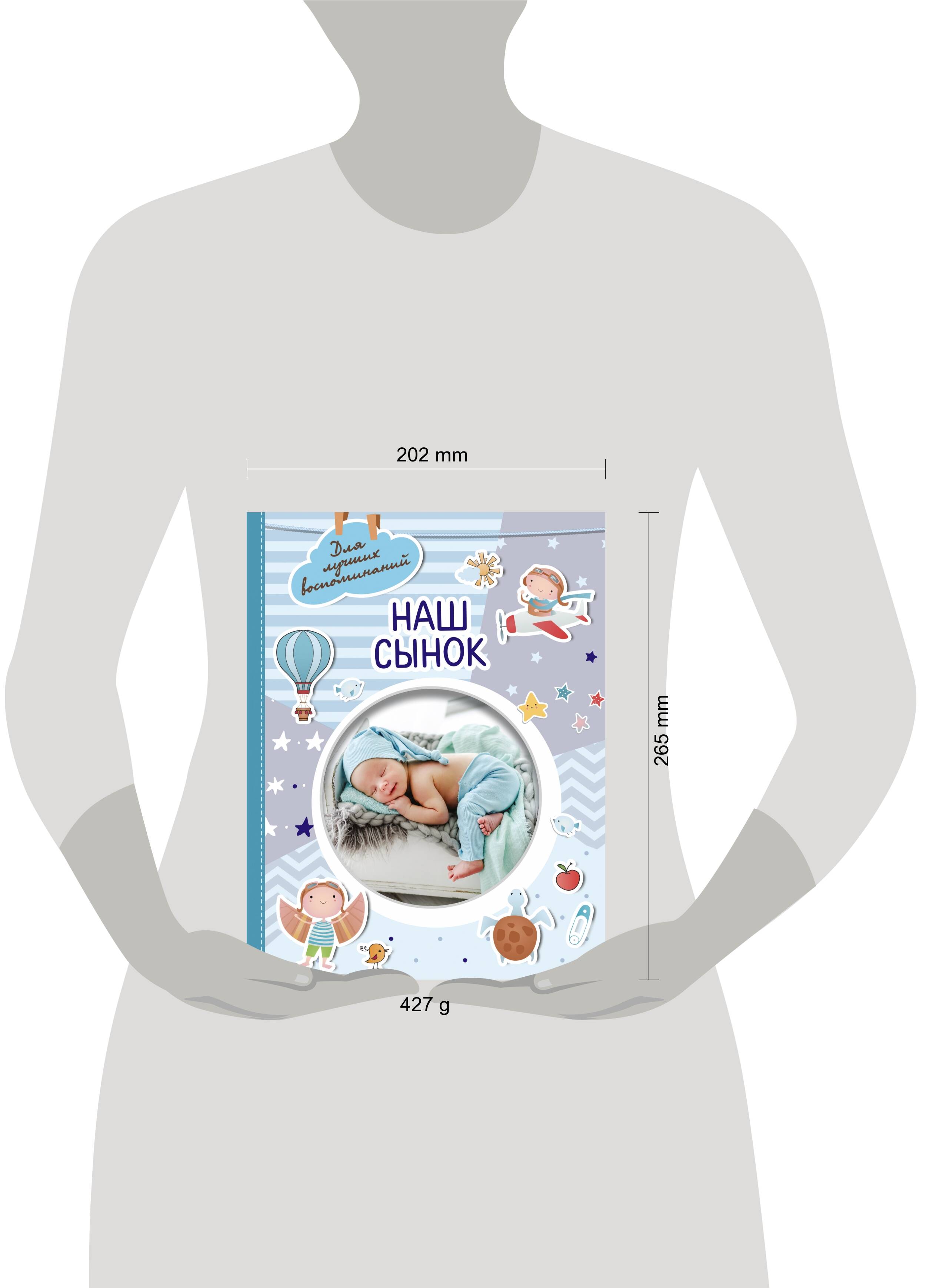 Ты родился и принёс радость в нашу жизнь! Твоя первая улыбка, первый шаг, первое слово - счастливые вехи в истории нашей семьи. Сохраните неповторимые мгновения первых лет жизни вашего сыночка в универсальном фотоальбоме. Альбом «Наш сынок» - рассчитан на период от рождения до 3 лет - от выписки из роддома до детского сада - вмещает 90 фотографий малыша формата 10х15 - содержит подсказки по заполнению, страницы для записи первых событий и успехов, таблицу роста, место для отпечатков ножек и ладошек.| Издательство | ИЗДАТЕЛЬСТВО "АСТ" |