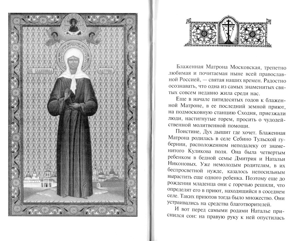 Блаженная Матрона Московская, трепетно любимая и почитаемая ныне всей православной Россией, - святая наших времен. Радостно осознавать, что одна из самых знаменитых святых совсем недавно жила среди нас. Еще в начале пятидесятых годов к блаженной Матроне, в ее последний земной приют, на подмосковную станцию Сходня, приезжали люди, настигнутые горем, просить о чудодейственной молитвенной помощи. Поистине, Дух дышит где хочет. Блаженная Матрона родилась в селе Себино Тульской губернии, расположенном неподалеку от знаменитого Куликова поля. Она была четвертым ребенком в бедной семье Дмитрия и Натальи Никоновых. Уже немолодым родителям, в их беспросветной нужде, казалось непосильным вырастить еще одного ребенка. Поэтому еще до рождения младенца они с горечью решили, что определят его в приют, находящийся в соседнем селе. Таких приютов тогда было множество. Они устраивались на средства благотворителей.| Издательство | Ковчег |
