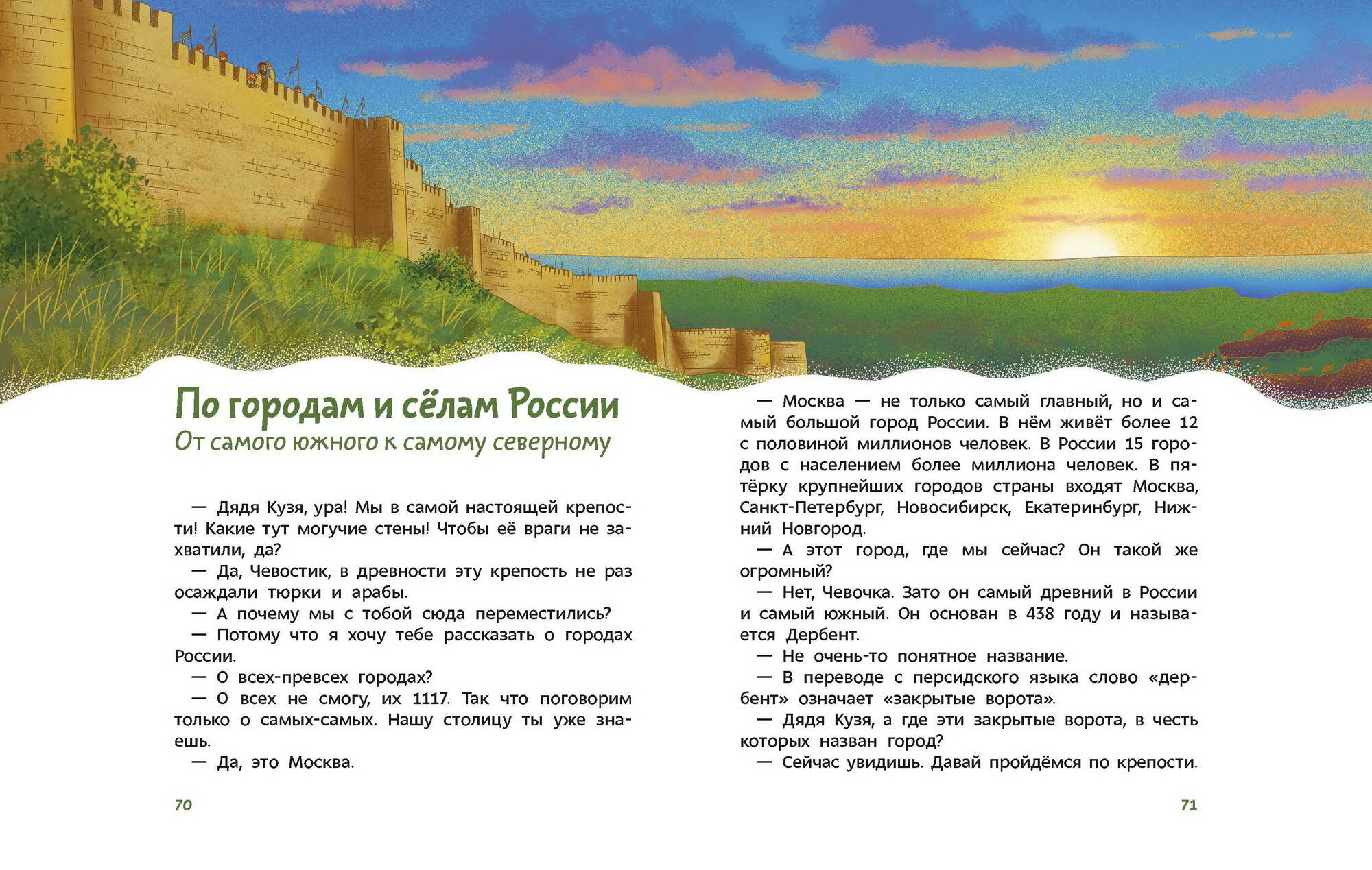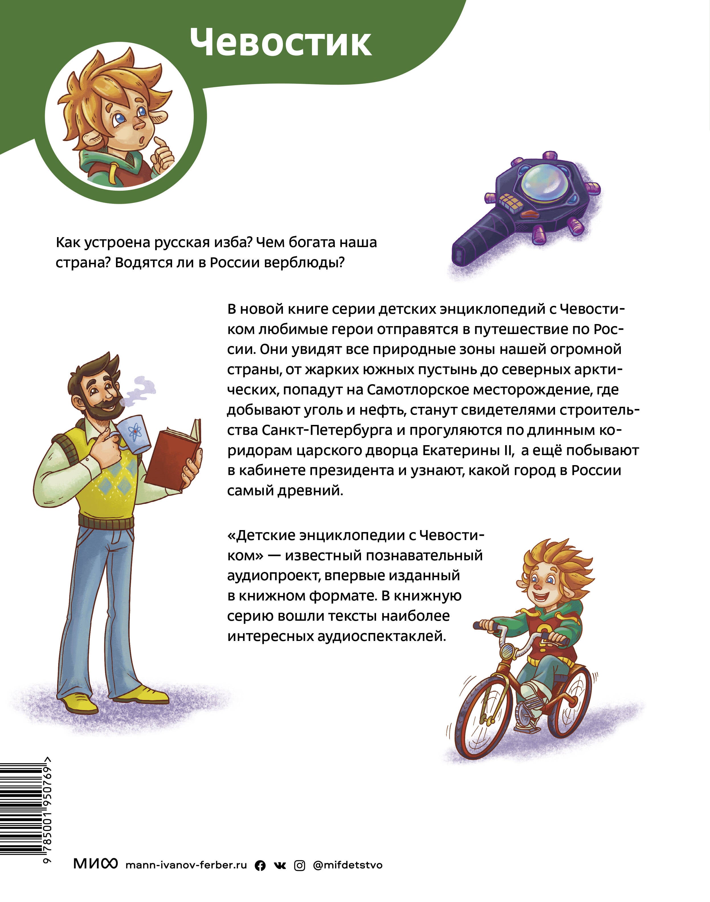 Чевостик и дядя Кузя отправляются в новое увлекательное путешествие - на этот раз по бескрайним просторам нашей страны. Герои пройдут путь от Древней Руси к современной России, от самой северной точки нашей родины к самой южной, увидят своими глазами, как строился Санкт-Петербург и взлетал в космос Юрий Гагарин, побывают в кабинете президента и узнают о многообразии русских городов и природных богатств. Фишки книги Новая энциклопедия с любимым героем - Чевостиком. Самое главное о стране, в которой мы живем. Знакомство с историей России (Древняя Русь, Российская империя, СССР) через ключевые события. Малыш узнает о природных и культурных богатствах России, местах добычи полезных ископаемых, городах и народах страны. Кто такой Чевостик? Чевостик - симпатичный герой из известного аудиопроекта. Сегодня ребята знают его по энциклопедиям. В серии продолжают выходить книги, которые объясняют детям устройство мира. Дети гораздо лучше воспринимают информацию, когда о мире им рассказывает какой-нибудь сказочный персонаж. Именно поэтому девчонки и мальчишки так любят подобные энциклопедии. Чевостик вместе с дядей Кузей совершает удивительные путешествия в мир наук: физики, химии, астрономии, анатомии, геологии и других. Он рассказывает детям о великих географических открытиях, покорении космоса и волшебных химических превращениях. Как читать книгу: Читать всей семьей и выполнять игровые задания. Для кого эта книга: Для любознательных детей в возрасте от 4 лет. Для всех-всех фанатов Чевостика. Для дошкольников и младших школьников.| Издательство | МАНН, ИВАНОВ И ФЕРБЕР ООО |