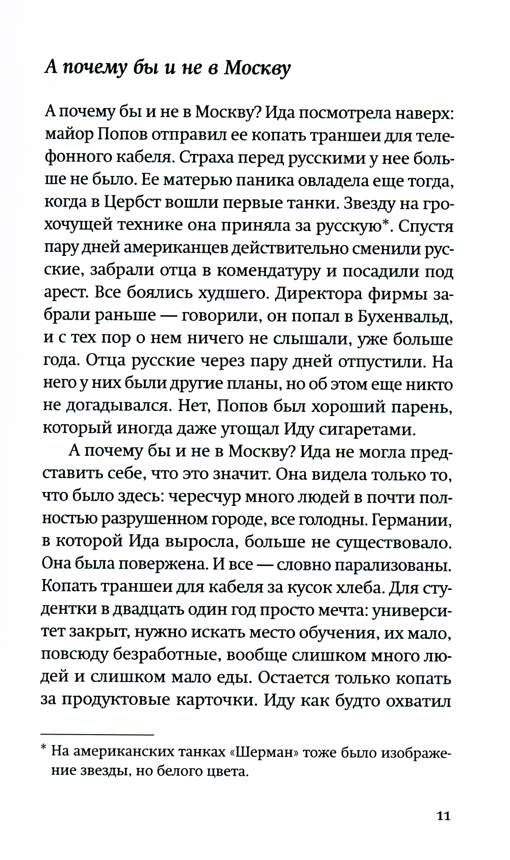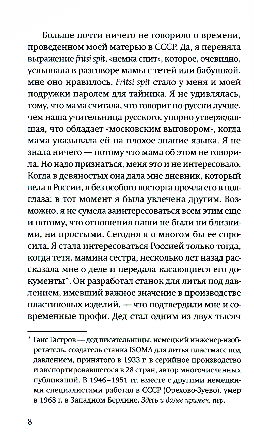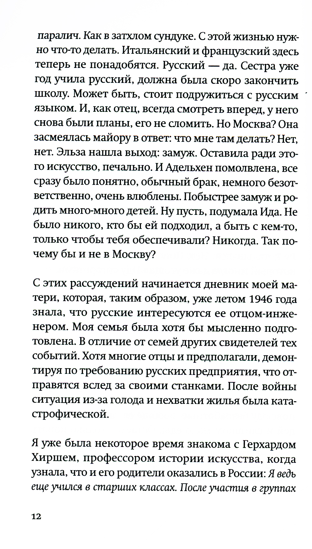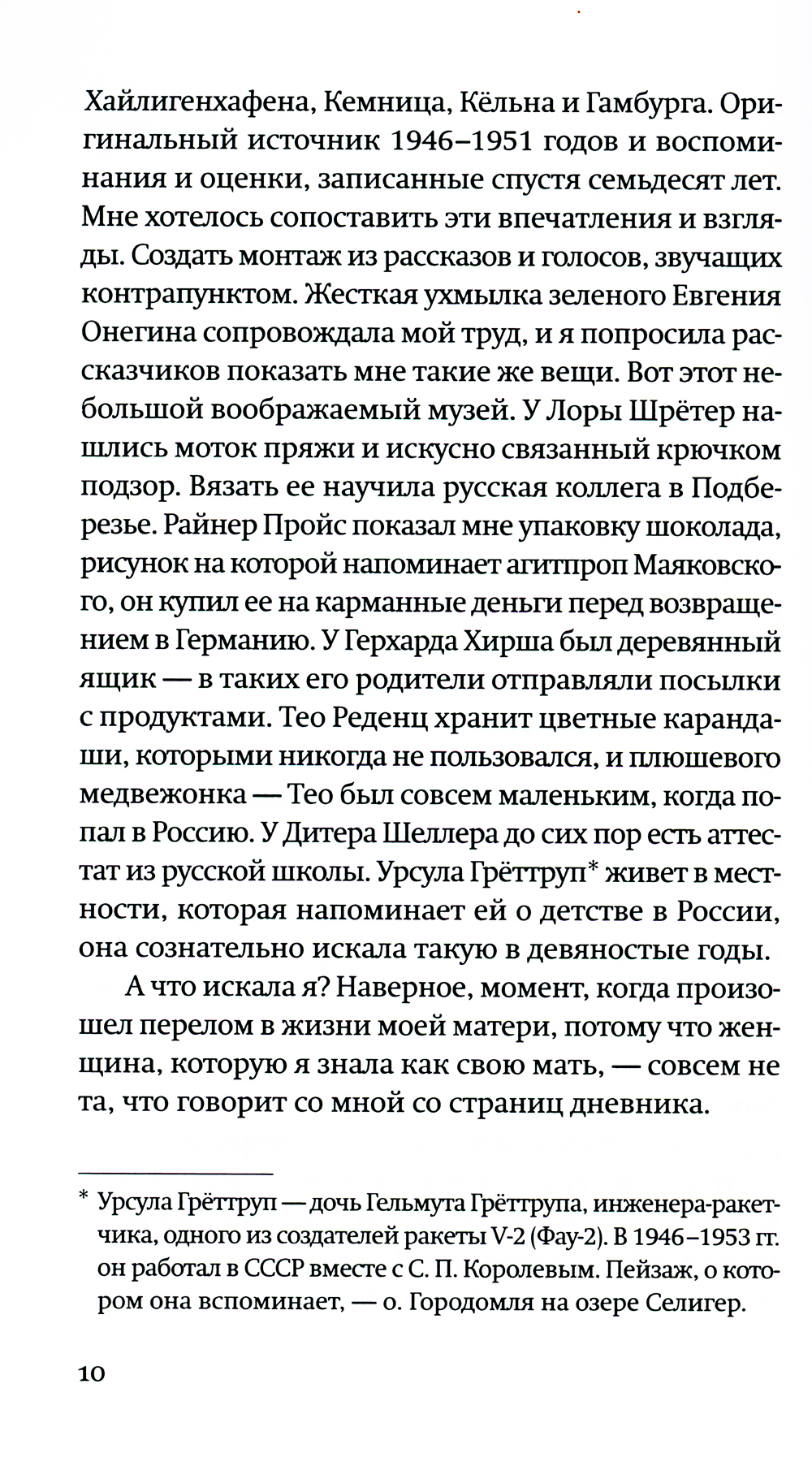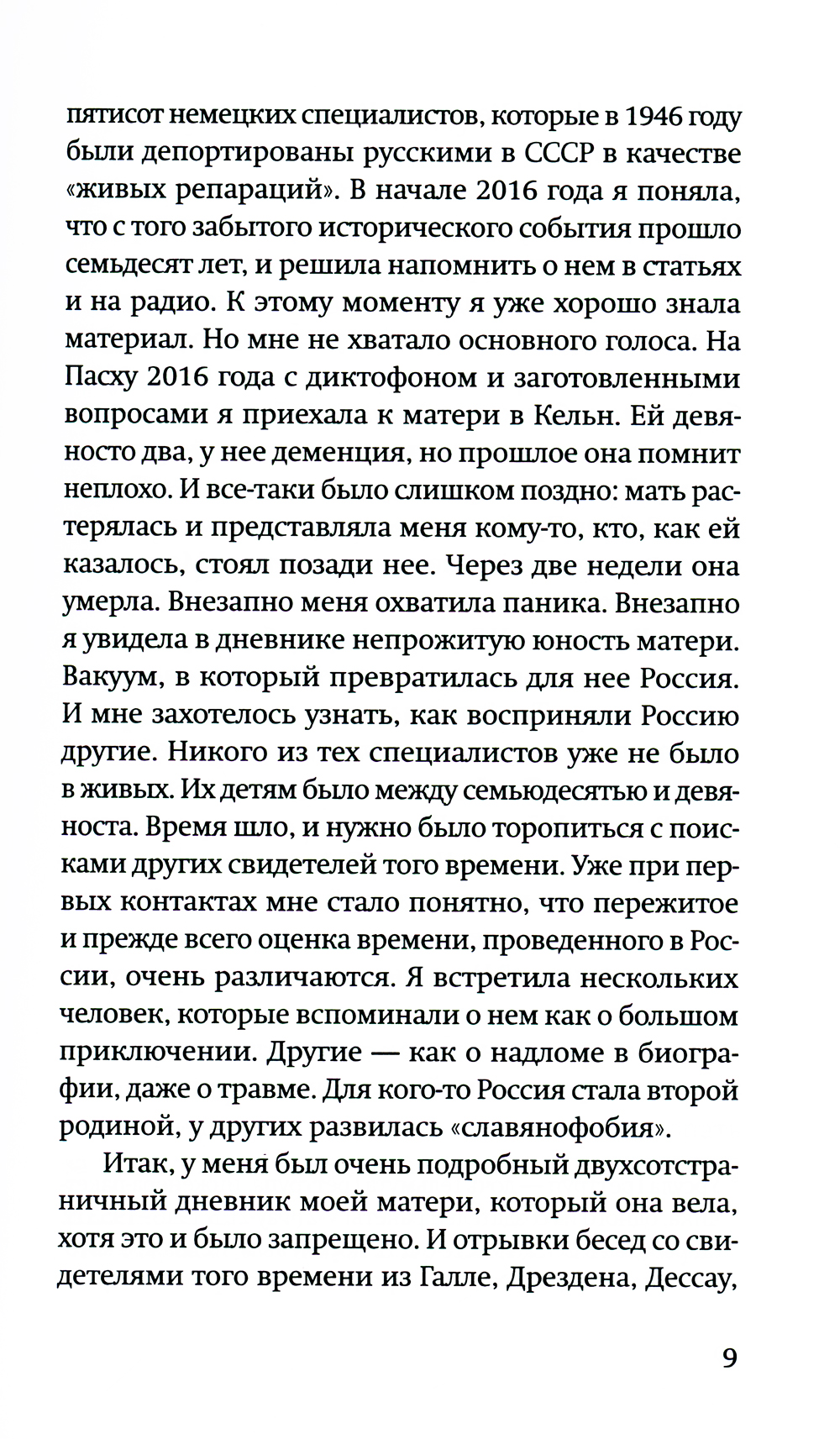 Неожиданный звонок в дверь разбудил две с половиной тысячи семей в советской оккупационной зоне в Германии - так 22 октября 1946 года началась секретная операция «Осоавиахим». Всего несколько часов спустя все эти люди - инженеры и техники авиационной и машиностроительной промышленности, отправленные в СССР в качестве «живых репараций», - сядут в поезд с неизвестным им пунктом назначения. Но двадцатидвухлетняя студентка Ида готова оставить разрушенную войной Германию, поездка в Россию кажется ей скорее захватывающим приключением. Книга основана на дневнике, написанном матерью автора. Его дополняют голоса других свидетелей, образуя калейдоскопическую картину жизни немецких специалистов в СССР. Для каждого этот опыт был разным, но перелом в биографии, оставивший след на всю последующую жизнь, стал общим для всех.| Издательство | Изд. Ивана Лимбаха |