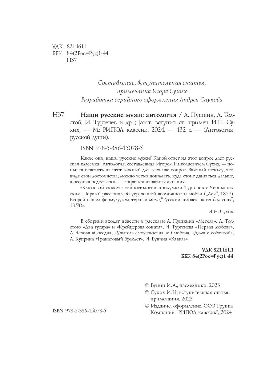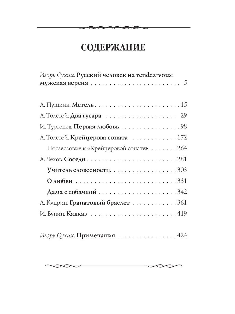 Какие они, наши русские мужи? Какой ответ на этот вопрос дает русская классика? Антология, составленная Игорем Николаевичем Сухих, - попытка в полной мере ответить на этот важный для всех нас вопрос. Важный - потому, что видя свои достоинства, можно четко понимать, куда стоит двигаться дальше, а осознав недостатки, - стараться избавиться от них. «Ключевой сюжет этой антологии придумали Тургенев с Чернышевским. Первый рассказал об утраченной возможности любви («Ася», 1857). Второй нашел формулу, культурный мем («Русский человек на rendez-vous», 1858)». И.Н. Сухих В сборник входят повести и рассказы А. Пушкина «Метель», Л. Толстого «Два гусара» и «Крейцерова соната», И. Тургенева «Первая любовь», А. Чехова «Соседи», «Учитель словесности», «О любви», «Дама с собачкой», А. Куприна «Гранатовый браслет», И. Бунина «Кавказ».| Издательство | Рипол Классик |