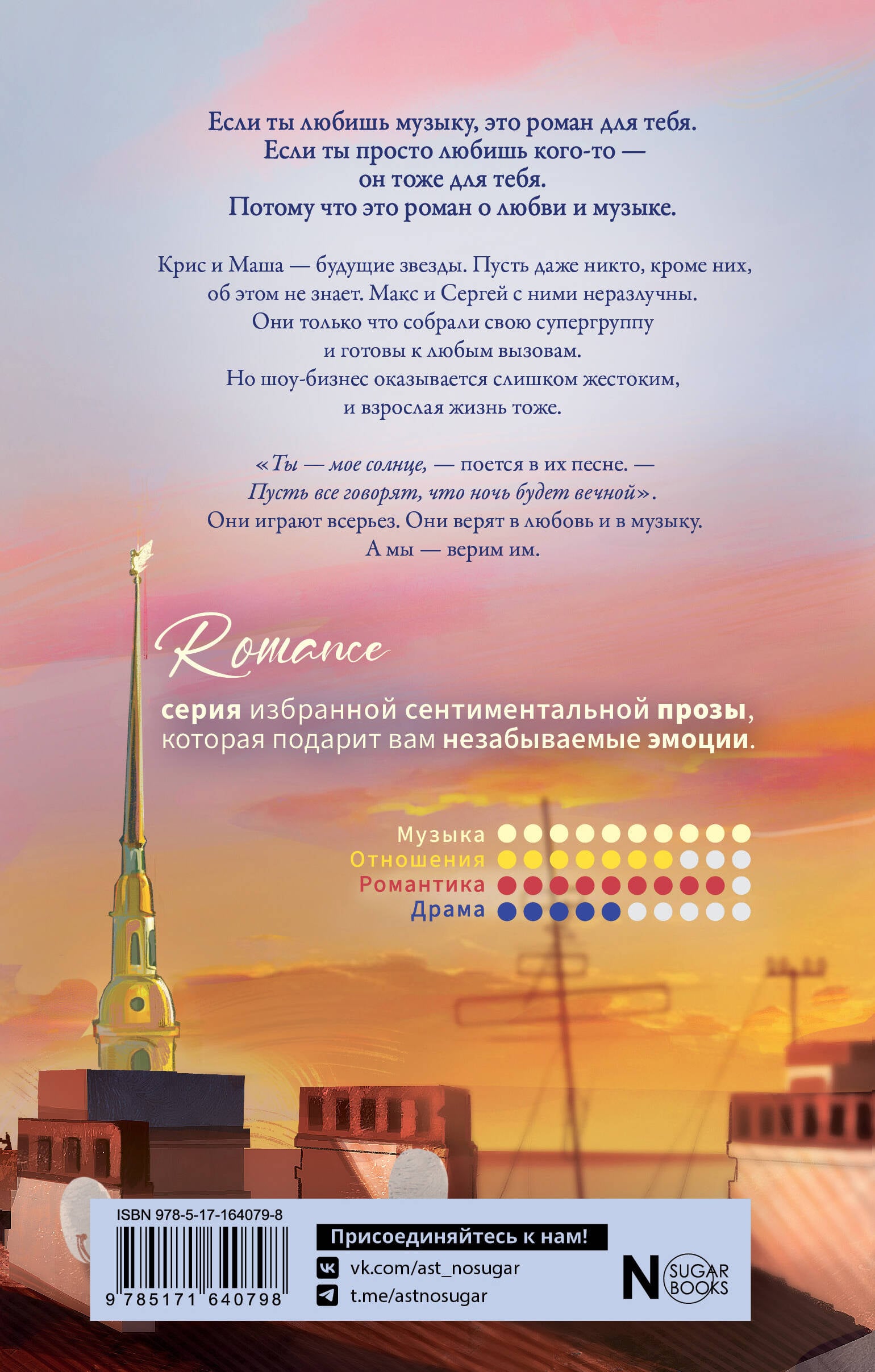 Если ты любишь музыку, это роман для тебя. Если просто любишь кого-то - он тоже твой. Потому что это роман о любви и музыке. Крис и Маша - будущие звезды. Пусть даже никто, кроме них, об этом не знает. Макс и Сергей с ними неразлучны. Они только что собрали свою супергруппу и готовы к любым вызовам. Но шоу-бизнес оказывается слишком жестоким, и взрослая жизнь тоже. "Ты - мое солнце, - поется в их песне. - Пусть все говорят, что ночь будет вечной". Они играют всерьез. Они верят в любовь и в музыку. А мы - верим им.| Издательство | Издательство "АСТ" |