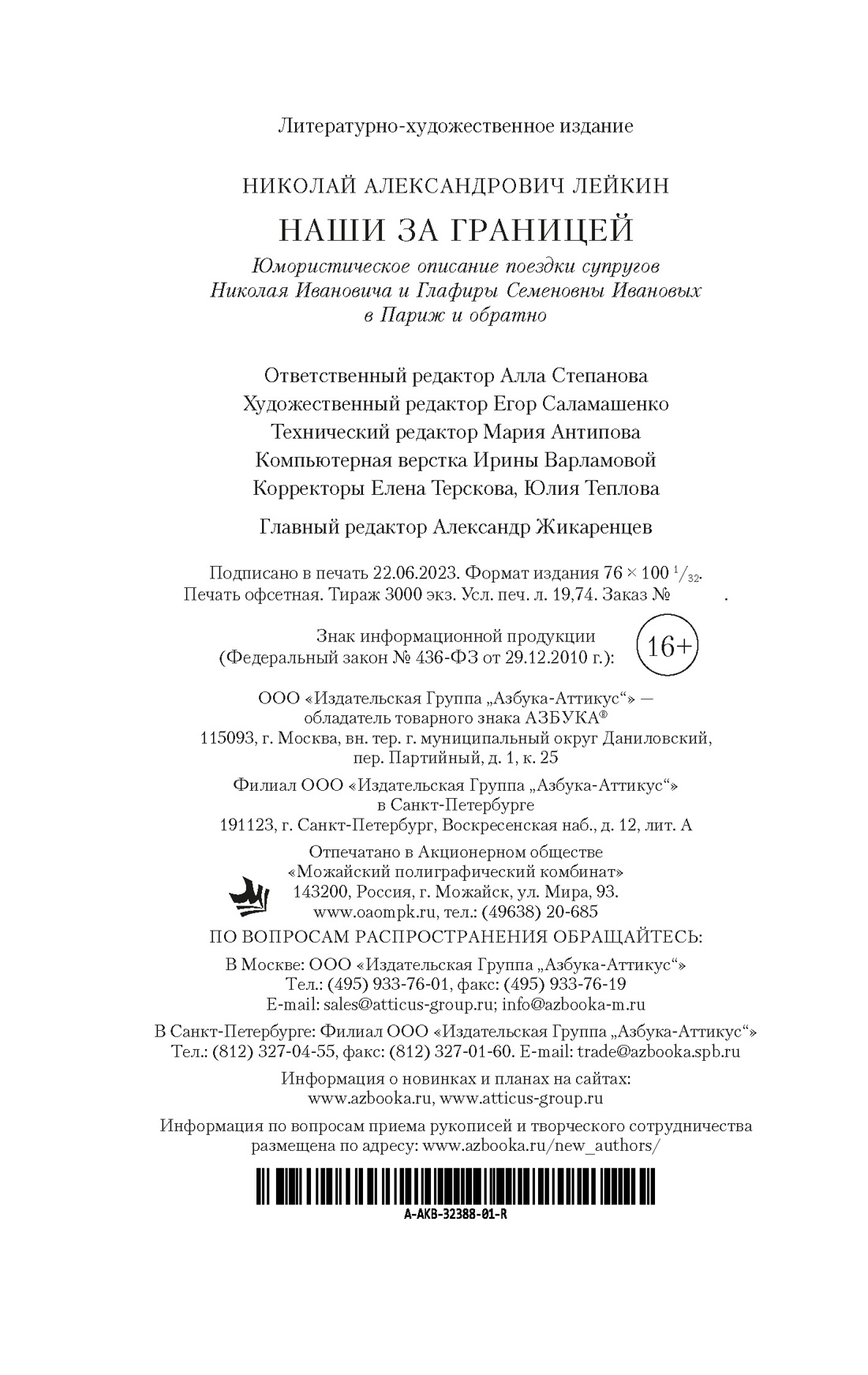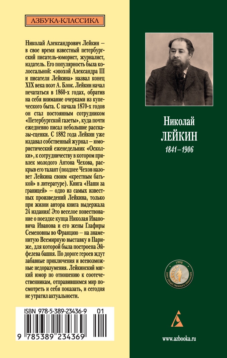 Николай Александрович Лейкин - в свое время известный петербургский писатель-юморист, журналист, издатель. Его популярность была колоссальной: «эпохой Александра III и писателя Лейкина» назвал конец XIX века поэт А. Блок. Лейкин начал печататься в 1860-х годах, обратив на себя внимание очерками из купеческого быта. С начала 1870-х годов он стал постоянным сотрудником «Петербургской газеты», куда почти ежедневно писал небольшие рассказы-сценки. С 1882 года Лейкин уже издавал собственный журнал - юмористический еженедельник «Осколки», к сотрудничеству в котором привлек молодого Антона Чехова, раскрыв его талант (позднее Чехов назовет Лейкина своим «крестным батькой» в литературе). Книга «Наши за границей» - одно из самых известных произведений Лейкина, только при жизни автора книга выдержала 24 издания! Это веселое повествование о поездке купца Николая Ивановича Иванова и его жены Глафиры Семеновны во Францию - на знаменитую Всемирную выставку в Париже, для которой была построена Эйфелева башня. По дороге героев ждут забавные приключения и всевозможные недоразумения. Лейкинский мягкий юмор по отношению к соотечественникам, отправившимся мир посмотреть и себя показать, и сегодня не утратил актуальности.| Издательство | Азбука |