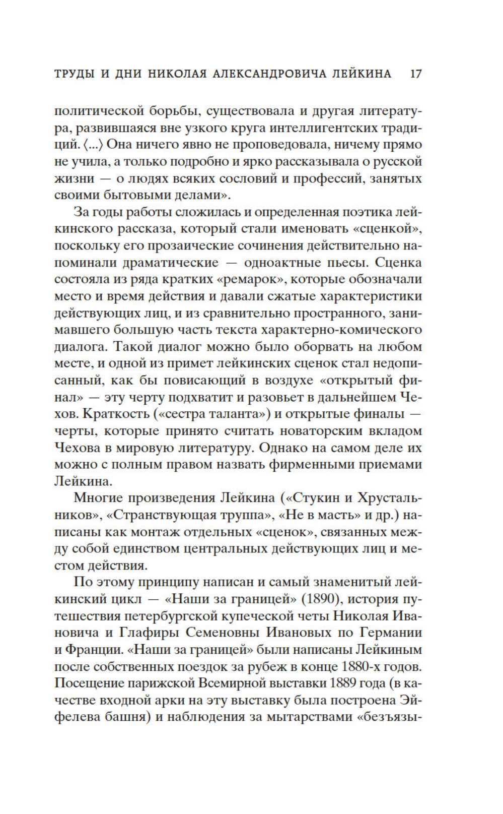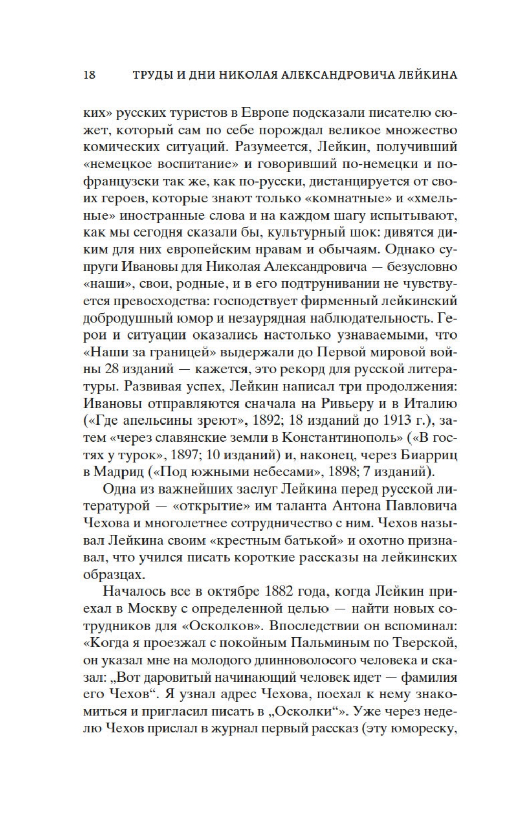 Николай Александрович Лейкин - в свое время известный петербургский писатель-юморист, журналист, издатель. Его популярность была колоссальной: «эпохой Александра III и писателя Лейкина» назвал конец XIX века поэт А. Блок. Лейкин начал печататься в 1860-х годах, обратив на себя внимание очерками из купеческого быта. С начала 1870-х годов он стал постоянным сотрудником «Петербургской газеты», куда почти ежедневно писал небольшие рассказы-сценки. С 1882 года Лейкин уже издавал собственный журнал - юмористический еженедельник «Осколки», к сотрудничеству в котором привлек молодого Антона Чехова, раскрыв его талант (позднее Чехов назовет Лейкина своим «крестным батькой» в литературе). Книга «Наши за границей» - одно из самых известных произведений Лейкина, только при жизни автора книга выдержала 24 издания! Это веселое повествование о поездке купца Николая Ивановича Иванова и его жены Глафиры Семеновны во Францию - на знаменитую Всемирную выставку в Париже, для которой была построена Эйфелева башня. По дороге героев ждут забавные приключения и всевозможные недоразумения. Лейкинский мягкий юмор по отношению к соотечественникам, отправившимся мир посмотреть и себя показать, и сегодня не утратил актуальности.