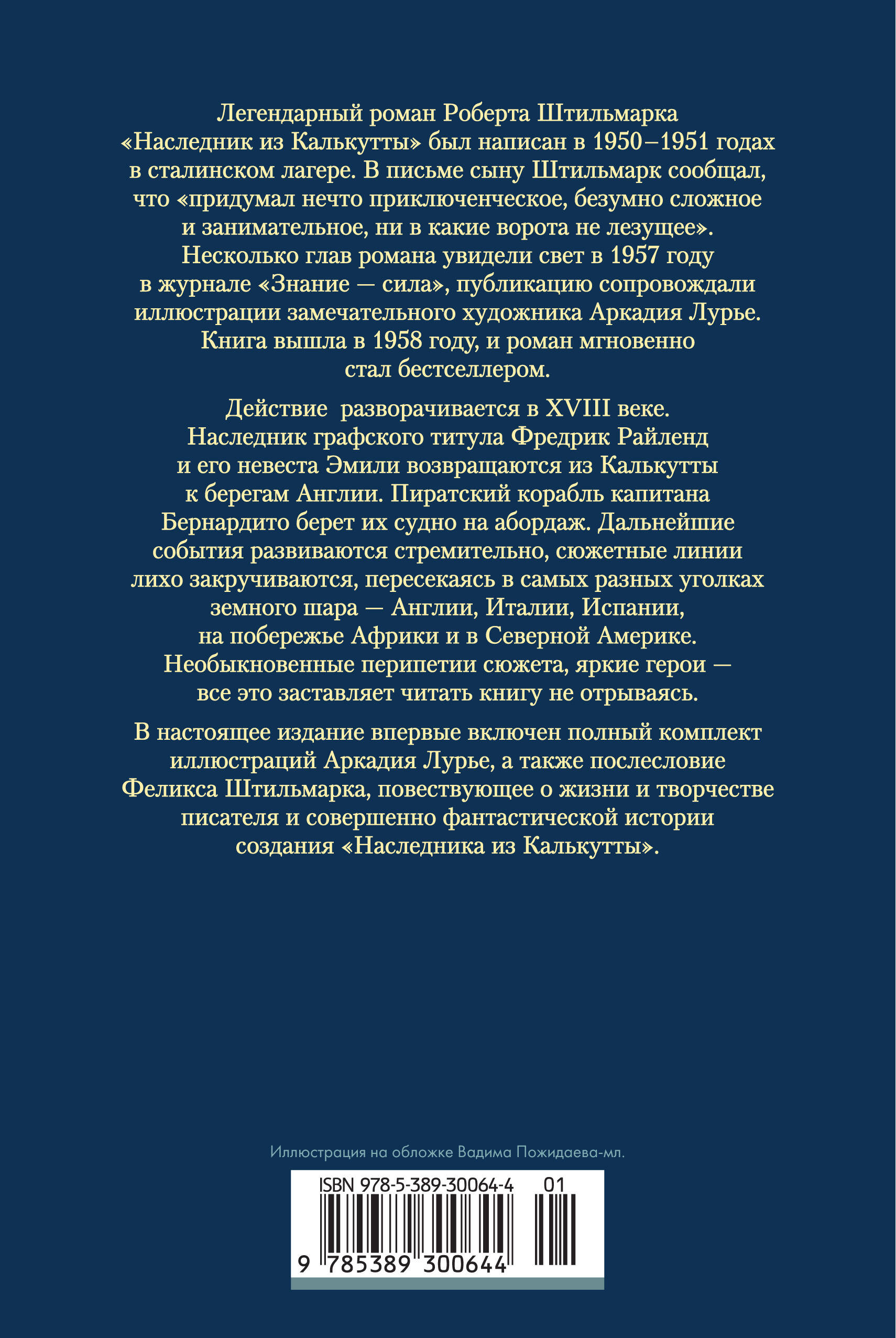 Легендарный приключенческий роман, история создания которого впечатляет не меньше, чем его прихотливый сюжет. Действие книги Роберта Штильмарка «Наследник из Калькутты» разворачивается в восемнадцатом веке, захватывая едва ли не половину земного шара. Лихие корсары, зарытые на дальних островах клады, кровавые дуэли, загадочные похищения и экзотические пейзажи - всё то, за что мы любим приключенческие романы. Пиратский корабль капитана Бернардито захватывает в Индийском океане судно с Фредриком Райлендом, наследником графского титула, и его невестой Эмили. Дальнейшие события стремительно развиваются в самых разных уголках земного шара - Англии, Италии, Испании, на побережье Африки и в Северной Америке. Необыкновенные перипетии сюжета, яркие герои - все это заставляет читать книгу не отрываясь. Роман сопровождается послесловием Феликса Штильмарка, повествующим о жизни и творчестве автора и удивительной истории создания «Наследника из Калькутты», и украшено полным комплектом иллюстраций Аркадия Лурье.