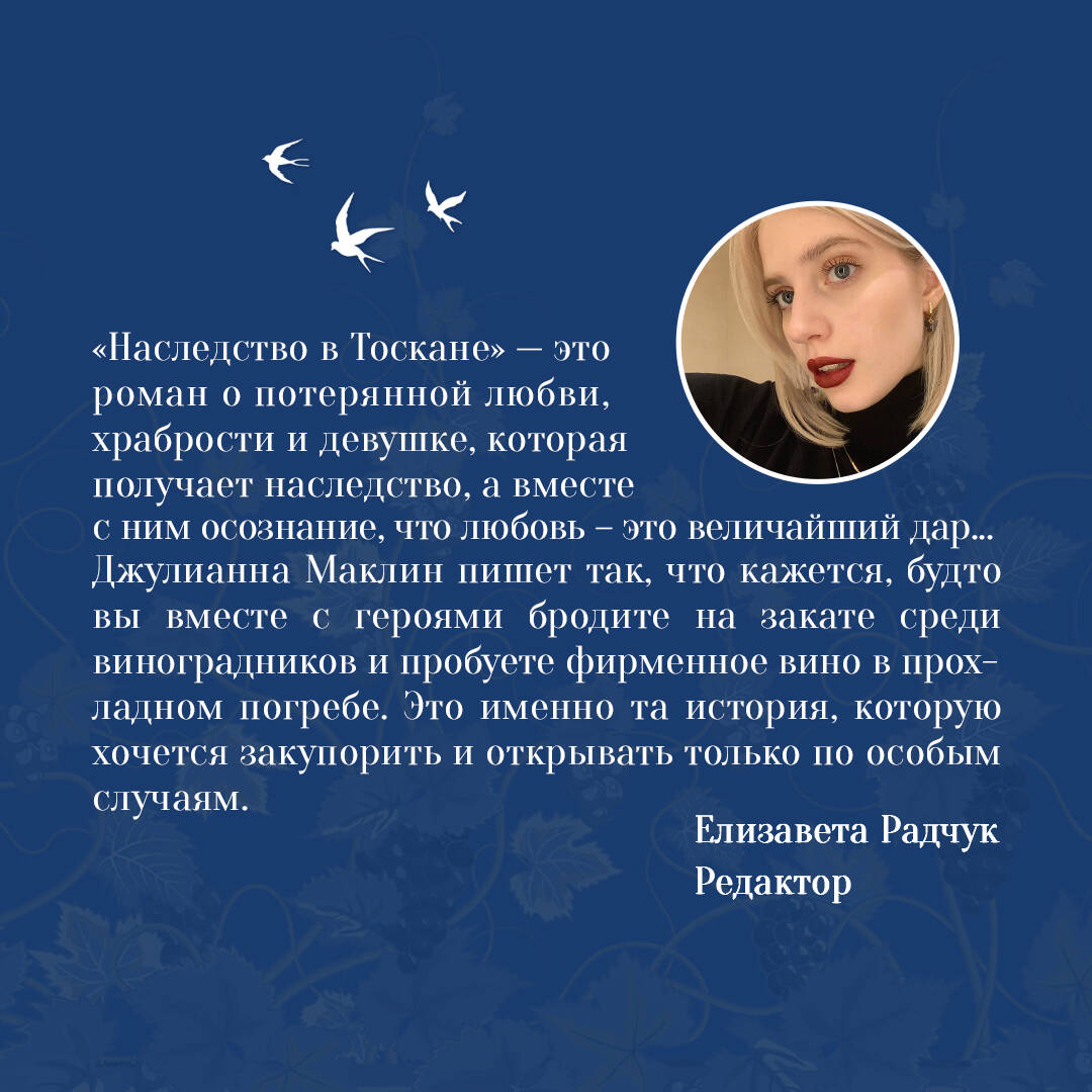 ЖИЗНЕУТВЕРЖДАЮЩАЯ ИСТОРИЯ, КОТОРАЯ ИДЕАЛЬНО СОЧЕТАЕТСЯ С БОКАЛОМ ВИНА. Всего один телефонный звонок перевернул мир Фионы Белл с ног на голову. Биологический отец, которого она никогда прежде не видела, умер и оставил ей в наследство шикарный дом и изумрудные виноградники в Тоскане. Бросив все, Фиона отправляется в солнечную Италию, где тридцать лет назад ее мать оказалась втянута в головокружительный роман. То лето изменило судьбы многих людей и оставило за собой вереницу тайн. Теперь Фионе предстоит не только разобраться с новоиспеченными родственниками, но и выяснить, что произошло тем летом и почему хранить чужие секреты - это так горько… Искрящееся вино, чарующие ароматы и залитые янтарным солнцем виноградники… Это история о любви, семье и тайнах прошлого, хранящихся на старой винодельне в Тоскане. Скорее берите бокал и наслаждайтесь красочным путешествием в Италию! «Эта трогательная история о любви и потере, о тоске и предательстве среди виноградных лоз в Тоскане - просто спасение в неспокойные времена». - Риз Боуэн, автор бестселлеров «Дворцовый переполох» и «Золотой ребенок Тосканы» «Богатые описания и внимание к деталям заставят вас дышать тосканским воздухом, а запутанные лозы из правды и лжи - усомниться в том, что правильно. Рекомендую прилечь с бокалом итальянского вина и насладиться каждой страницей». - Донна Олвард, автор бестселлеров New York Times «"Наследство в Тоскане" - это захватывающий роман, который исследует сложность человеческого сердца. Эта проникновенная и глубоко романтичная история разбила мне сердце. Не оторваться!» - Аманда Проуз, автор мировых бестселлеров «Эмоциональная история о любви, семье и прощении. Она одновременно душераздирающая и обнадеживающая; я переживала за каждого героя». - Рошель Вайнштейн, автор бестселлеров USA Today| Издательство | ООО "Издательство "Эксмо" |