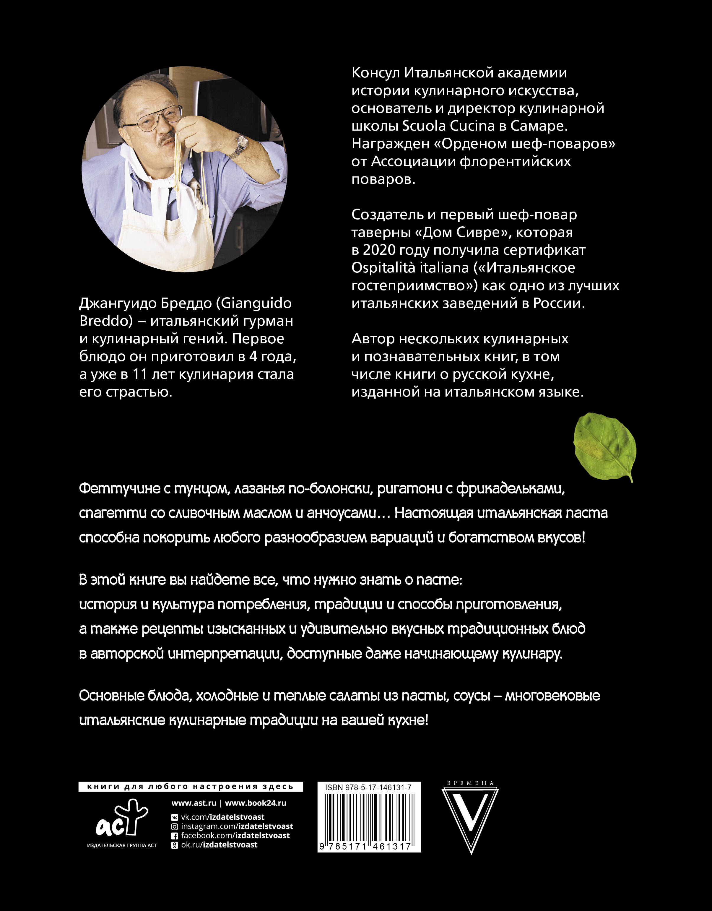 На страницах этой книги вы найдете краткие сведения об истории и культуре потребления, традициях и способах приготовления пасты, а также рецепты изысканных и удивительно вкусных традиционных блюд в авторской интерпретации, доступные даже начинающему кулинару. Основные блюда, холодные и теплые салаты из пасты, соусы - многовековые итальянские кулинарные традиции на вашей кухне!| Издательство | ИЗДАТЕЛЬСТВО "АСТ" |