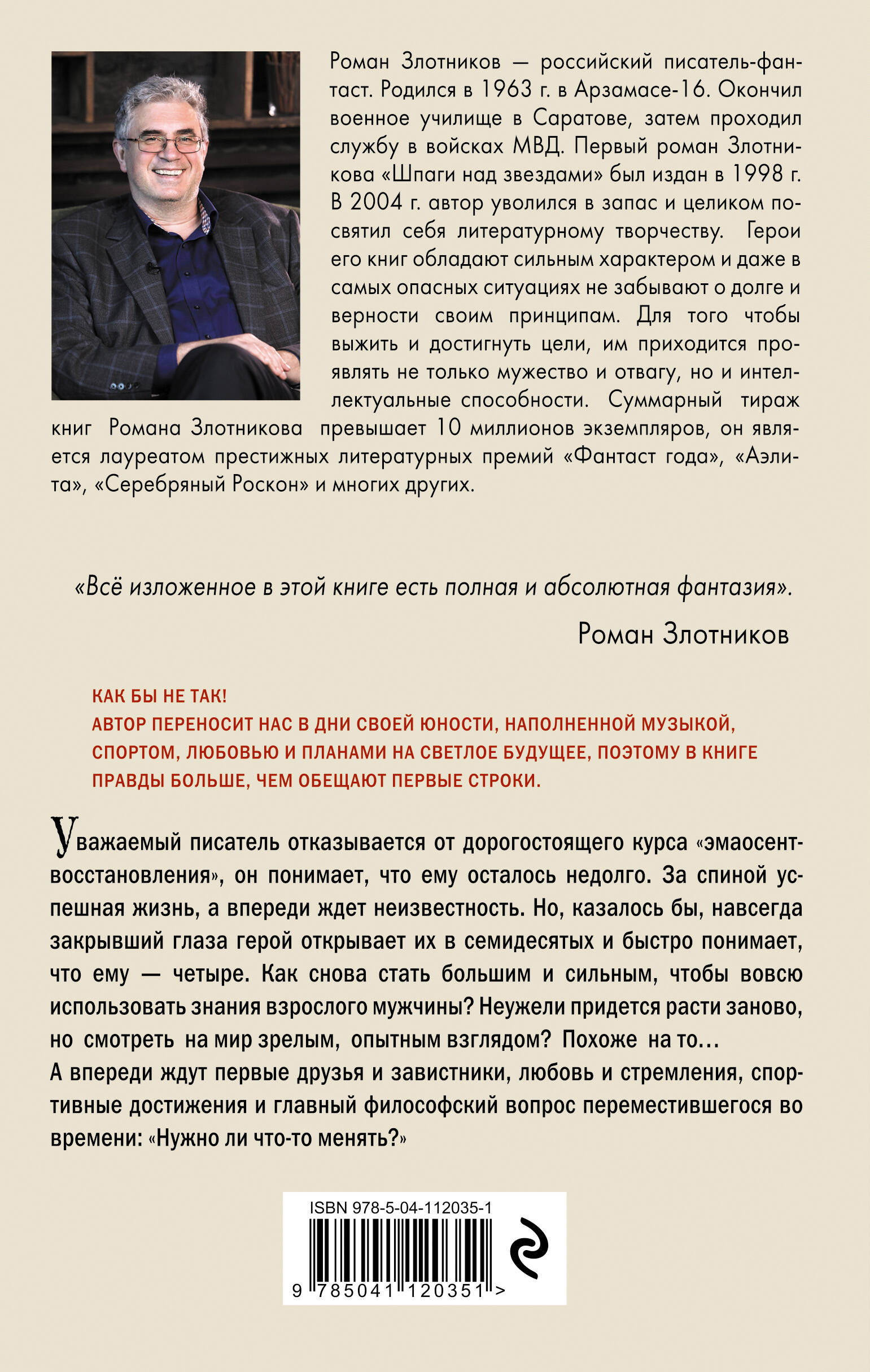 Роман Злотников - титулованный автор, приключенческой и боевой фантастики, обладатель премий «Аэлита», «Бастион», «Лунная Радуга», «РосКон», «Серебряная стрела» и «Электронная буква». Особенность произведений Злотникова - яркие и запоминающиеся герои, реалистичные битвы, тонкое чувство реальности и богатый внутренний мир. «Всё, изложенное в этой книге - есть полная и абсолютная фантазия» - Р. Злотников Как бы не так! Автор переносит нас в дни своей юности, наполненной музыкой, спортом, любовью и планами на светлое будущее, поэтому в книге правды больше чем обещают первые строки. Уважаемый писатель отказывается от дорогостоящего курса «эмаосент-восстановления», он понимает, что ему осталось недолго. За спиной успешная жизнь, а впереди должна ждать неизвестность. Но, казалось бы, навсегда закрывший глаза герой, открывает их в семидесятых и быстро понимает, что ему - четыре. Как снова стать большим и сильным, чтобы во всю использовать знания взрослого мужчины? Неужели придется расти заново, но смотреть на мир зрелым, опытным взглядом? Похоже на то... А впереди ждут первые друзья и завистники, любовь и стремления, спортивные достижения и главный философский вопрос переместившегося во времени «нужно ли что-то менять?»| Издательство | ООО "Издательство "Эксмо" |