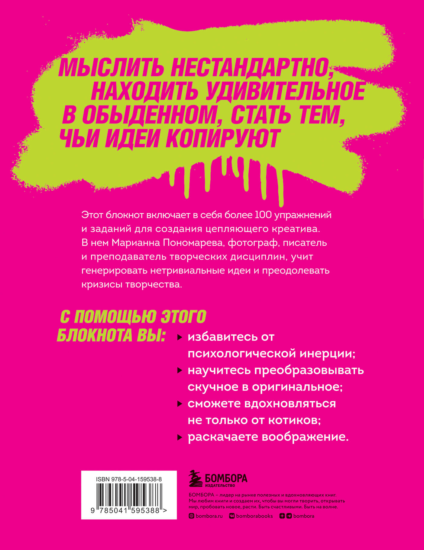 Мыслить нестандартно, находить удивительное в обыденном, стать тем, чьи идеи копируют. Этот блокнот включает в себя более 100 упражнений и заданий для создания цепляющего креатива. В нем Марианна Пономарева, фотограф, писатель и преподаватель творческих дисциплин, учит генерировать нетривиальные идеи и преодолевать кризисы творчества. С помощью этого блокнота вы: - избавитесь от психологической инерции; - научитесь преобразовывать скучное в оригинальное; - сможете вдохновляться не только от котиков; - раскачаете воображение.| Издательство | ООО "Издательство "Эксмо" |