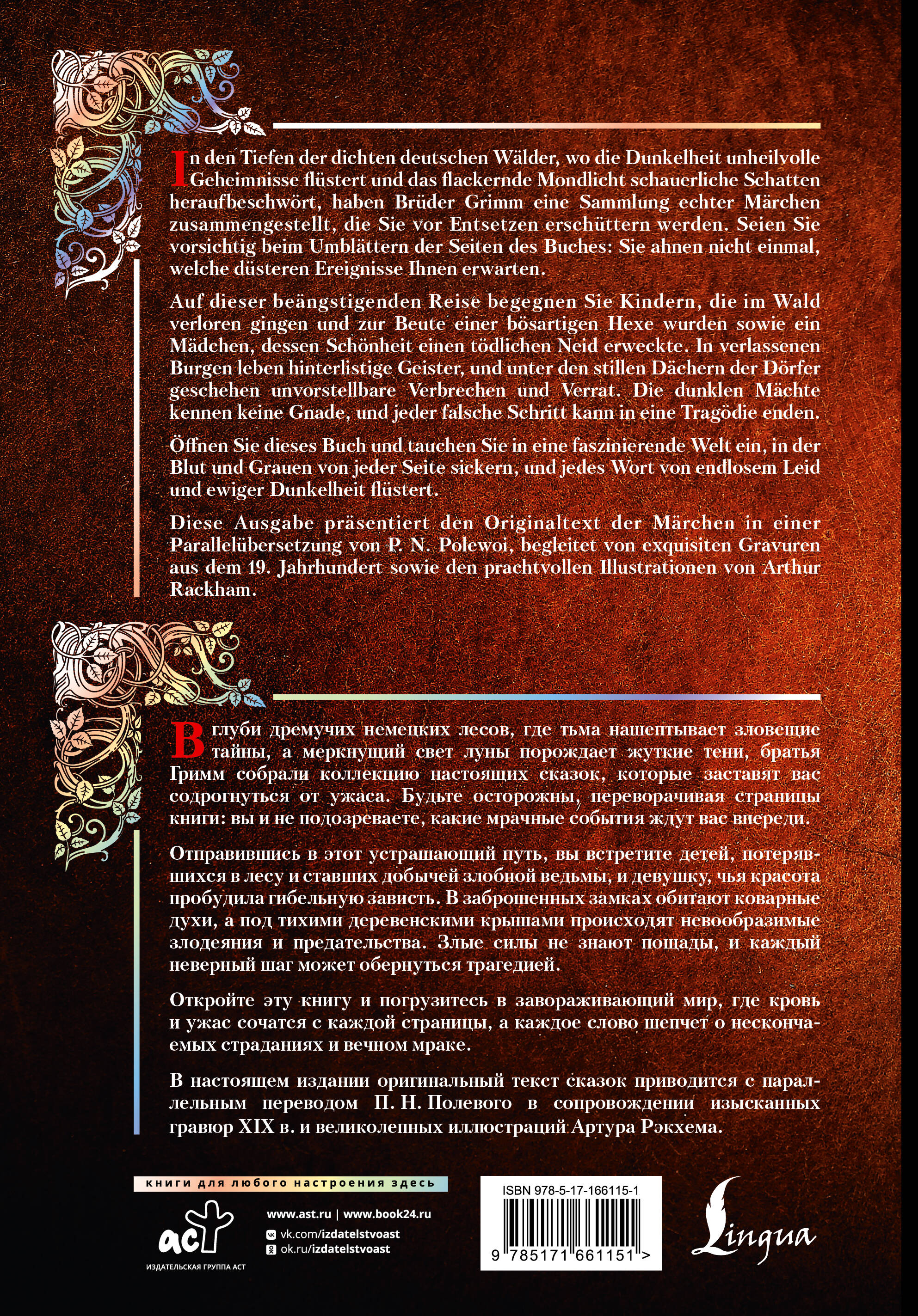 В глуби дремучих немецких лесов, где тьма нашептывает зловещие тайны, а меркнущий свет луны порождает жуткие тени, братья Гримм собрали коллекцию настоящих сказок, которые заставят вас содрогнуться от ужаса. Будьте осторожны, переворачивая страницы книги: вы и не подозреваете, какие мрачные события ждут вас впереди. В этом сборнике перед вами предстанут не добрые сказки, а пугающие истории о злобных ведьмах, коварных духах, древних проклятиях и невообразимых злодеяниях. Откройте эту книгу и погрузитесь в завораживающий мир, где кровь и ужас сочатся с каждой страницы, а каждое слово шепчет о нескончаемых страданиях и вечном мраке. В настоящем издании оригинальный текст сказок приводится с параллельным переводом П. Н. Полевого в сопровождении изысканных гравюр XIX в. и великолепных иллюстраций Артура Рэкхема. Для удобства чтения русский текст расположен параллельно с немецким, что позволит без труда сравнивать оригинал с переводом, обращать внимание на трудности, с которыми сталкивались переводчики, и отмечать наиболее точно переведенные фрагменты. Страшной красоты обложка, твердый переплет с красной ленточкой ляссе и подарочное оформление внутри добавляют книге изысканность и привлекательность. Ее можно приобрести не только для своей коллекции, но и в качестве подарка дорогим и близким людям.| Издательство | Издательство "АСТ" |