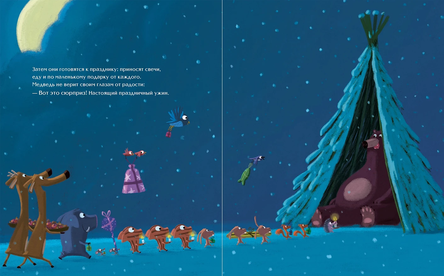 Вечер был тихий и снежный. Все вместе они ели, болтали, пели и делились весёлыми историями. А в полночь птицы устроили концерт.
