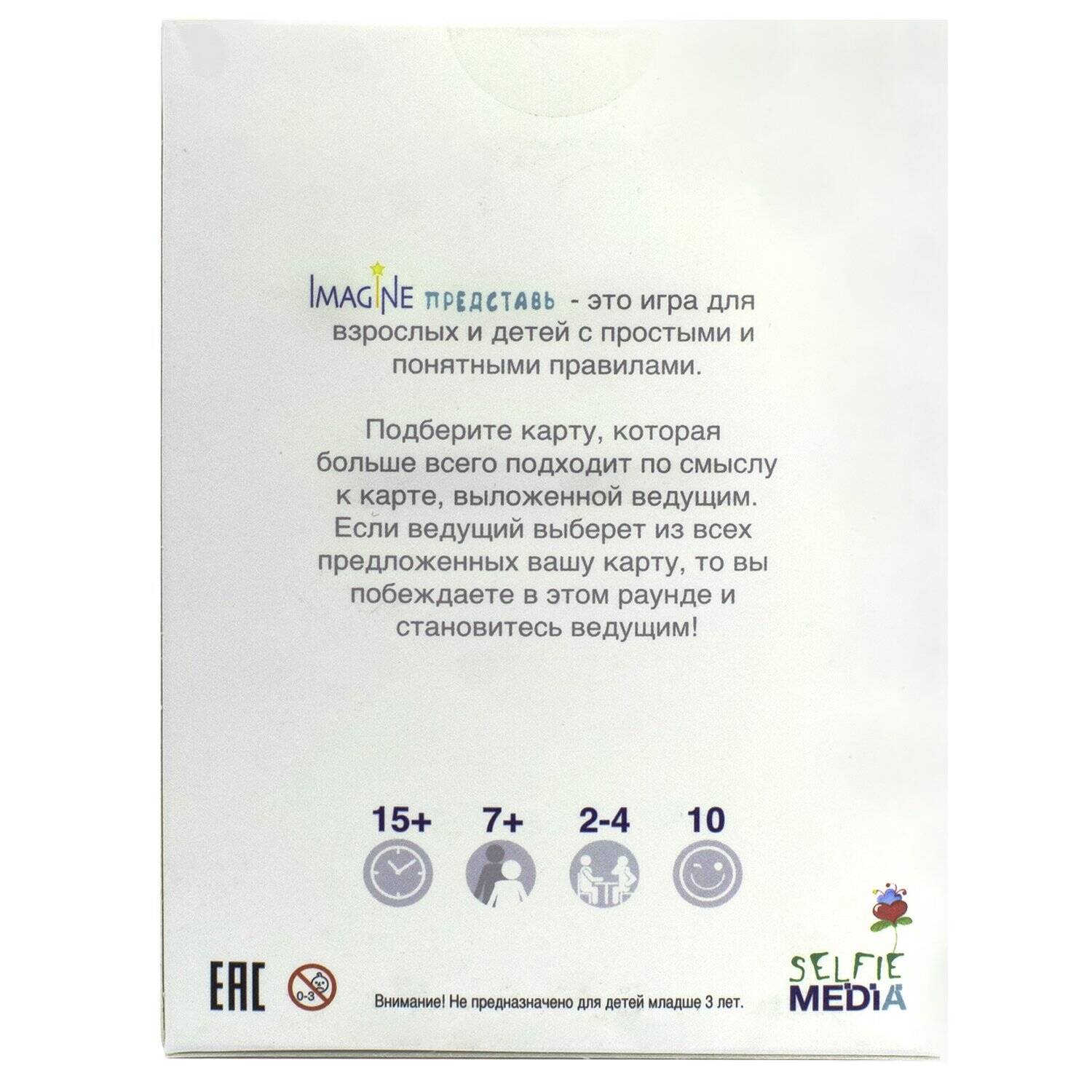 Очень веселая и увлекательная игра Imagine (Представь) от бренда Selfie media обязательно понравится вашим детям и их друзьям! Это игра на развитие логического мышления. Для того, чтобы заработать больше очков, необходимо подобрать ассоциации (существительные) к различным прилагательным. Ведущий предлагает прилагательные, а остальные игроки стараются быстрее всех подобрать существительное. Взятку забирает тот, чья карта лучше всех подойдет по смыслу к предложенному прилагательному. Как только кто-то из игроков набрал 5 взяток, он победил! Эта игра отлично подойдет для игры как дома, так и в путешествии. В комплекте 45 карт и правила игры. Рекомендуемый возраст: от 7 лет.| Издательство | ЮНИТОЙС МСК ООО |