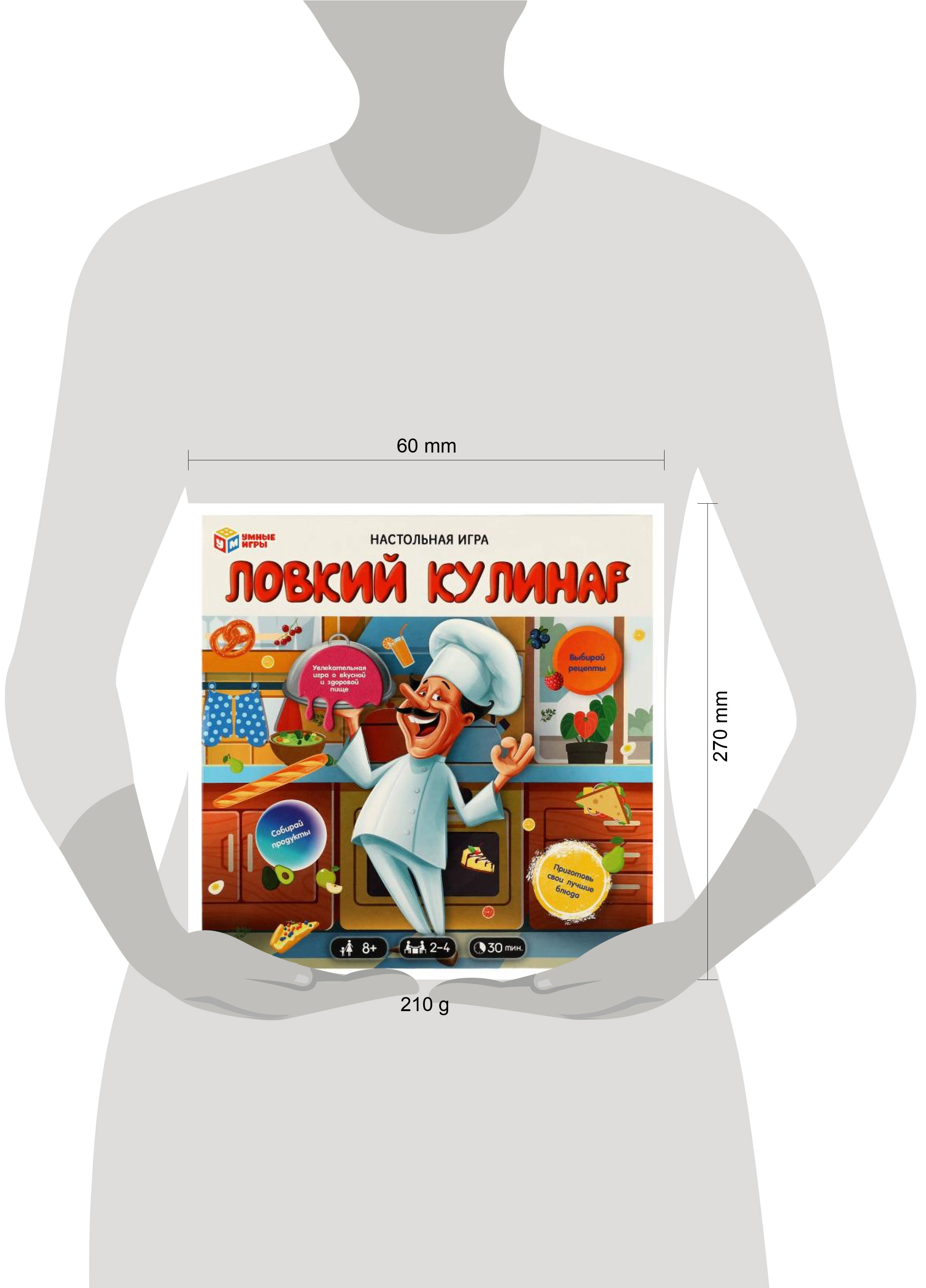 Настольная игра "Ловкий кулинар" ТМ "Умные игры" - увлекательная игра о вкусной и здоровой пище: - выбирай рецепты - собирай продукты - приготовь свои лучшие блюда! Особенности: - количество игроков: 2-4 - продолжительность игры: от 30 минут Состав игры: - игровое поле - 40 карточек - 4 фишки и кубик - правила игры Участвуйте в самом вкусном соревновании и выясните, кто из вас самый ловкий кулинар! Вам предстоит отбирать продукты и искать подходящие рецепты, чтобы приготовить свои лучшие блюда. Вооружитесь карточками и кубиком вместо поварёшки и разделочной доски и сотворите обед, достойный настоящего шеф-повара. В этой игре игровое поле нужно для подсчёта очков. Игровые карточки являются одновременно и продуктами, и рецептами блюд. Для того чтобы использовать карточки как продукты, выложите их на полки холодильника. В качестве рецептов используйте только карточки с руки. ЦЕЛЬ ИГРЫ Набрать наибольшее количество очков и стать самым ловким кулинаром. Игра заканчивается тогда, когда заканчиваются карты в колоде и на руках у всех игроков. ПОДГОТОВКЕ К ИГРЕ Тщательно перемешайте игровые карточки и раздайте по 5 карточек каждому игроку. Оставшиеся карточки положите рубашкой вверх рядом с игровым полем. Игроки выбирают себе фишки и ставят их на клетку "0" на игровом поле - в начале игры у каждого из игроков 0 баллов. Чтобы определить очерёдность хода, игроки бросают кубик. Первым ходит тот, у кого выпало наибольшее количество очков. Далее по часовой стрелке. Дайте игрокам время (2-5 минут) ознакомиться с картами на руках и продумать свою стратегию победы. ХОД ИГРЫ В свой ход игрок может сделать одно из следующих действий: - выложить карточку как продукт; - использовать карточку как рецепт. Чтобы использовать карточку в качестве продукта, игрок выкладывает карточку на полки холодильника на игровом поле лицом вверх. Если там ещё не лежит карточка с подобным продуктом, то игрок получает 1 балл. Если карточка с таким продуктом уже присутствует, то игрок кладёт свою карточку на неё сверху и не получает баллы. Продукты с полок холодильника могут использовать все игроки. Будьте внимательны, использовать в качестве продукта при приготовлении блюда карту с руки нельзя. Если на полках холодильника лежат все необходимые для рецепта продукты, игрок может использовать карточку с руки в качестве рецепта и приготовить блюдо. Для этого игрок выкладывает перед собой карточку рецепта и кладёт на неё рубашкой вверх необходимые продукты. Будьте внимательны, продукты и ингредиенты для блюда можно брать только с полок холодильника или со стола, а карточки с рецептами разыгрываются только с руки. В качестве ингредиента для рецепта может выступать не только продукт, но и другое блюдо. В таком случае игрок берёт карточку этого блюда, приготовленную им или другим игроком, и выкладывает поверх своего нового рецепта рубашкой вверх. Все продукты, которые использовались для приготовления исходного блюда, возвращаются на полки холодильника. За приготовление блюда игрок получает столько очков, сколько указано в углу соответствующей карточки с рецептом. В конце хода игрок берёт карточку из колоды, лежащей рядом с игровым полем. На руках у игроков должно быть по 5 карт. Если карточки в колоде уже закончились, игроки пропускают эту часть хода. Игра длится до тех пор, пока на рука