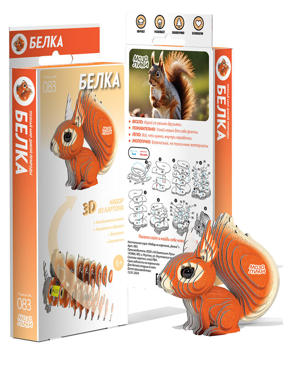 Развивающие 3Д пазл "Мазалики" "083 Белка". В комплекте есть все что нужно для сборки. Собирайте без труда и дополнительных инструментов. Вот что вы получите: Картонная коробка с информацией - 1 шт. Карточки с пронумерованными деталями - 7 шт. Тюбик клея, 5 мл - 1 шт. Бусинки-глазки в бумажном пакетике - 2 шт. Листовка с описанием. Тайна разгадана! Знакомьтесь с нашим новым персонажем - Любознательной Белкой. Это существо с удивительной страстью к орехам, но знали ли вы о их невероятной роли в жизни леса? Белки, закапывая орехи на зиму, не всегда могут их найти. Забытые орехи дарят жизнь новым деревьям, обогащая и восстанавливая лесные массивы. Вдохновитесь удивительной интуицией и игривостью белок, собирая наш новый пазл "Белка". Познакомьтесь поближе с жизнью этих милейших зверьков. Мазалики - это не просто игрушка, а окно в мир природы, где каждое существо играет ключевую роль.
