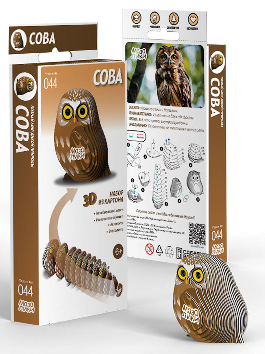 Развивающие 3Д пазл "Мазалики" "044 Сова". В комплекте есть все что нужно для сборки. Собирайте без труда и дополнительных инструментов. Вот что вы получите: Картонная коробка с информацией - 1 шт. Карточки с пронумерованными деталями - 7 шт. Тюбик клея, 5 мл - 1 шт. Бусинки-глазки в бумажном пакетике - 2 шт. Листовка с описанием. Погрузитесь в мир птиц с помощью головоломки Сова от Мазалики. Наша тщательно продуманная головоломка отражает сущность этих великолепных птиц, демонстрируя их экстраординарные черты и способности. Обладая острым бинокулярным зрением, совы - искусные охотники, бесшумно набрасывающиеся на свою добычу, не издавая ни звука. Собирая этот замысловато оформленный пазл, вы перенесетесь в залитый лунным светом лес, где безраздельно правят совы. Приготовьтесь быть очарованными красотой и грацией этих ночных созданий, собирая воедино эту увлекательную головоломку совы.