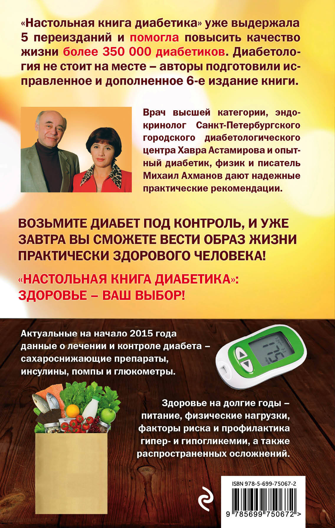 Эта книга - уникальный лонгселлер, который рекомендуют друг другу уже второе поколение людей, у которых обнаружен диабет. Ее уникальность также в том, что она написана в тандеме врач-писатель. Врач-эндокринолог Хавра Саидовна Астамирова отвечает за абсолютную надежность, безопасность и современность предоставляемой медицинской информации, а профессиональный писатель Михаил Сергеевич Ахманов излагает материал последовательно, интересно и понятно. Вместе авторы дают читателю возможность овладеть нужными навыками, разобраться в препаратах и продуктах питания, чтобы вести образ жизни практически здорового человека. Михаил Сергеевич знает точно, что нужно людям с диабетом, и и не дает ничего лишнего, т.к. не скрывает, что он тоже один из вас. Михаил Ахманов под руководством эндокринолога так научился компенсировать свой диабет, что он не мешает ему интенсивно работать в его продвинутом возрасте, путешествовать, быть любящим, заботливым мужем и отцом и верным другом. В своей книге он научит вас тому же.
