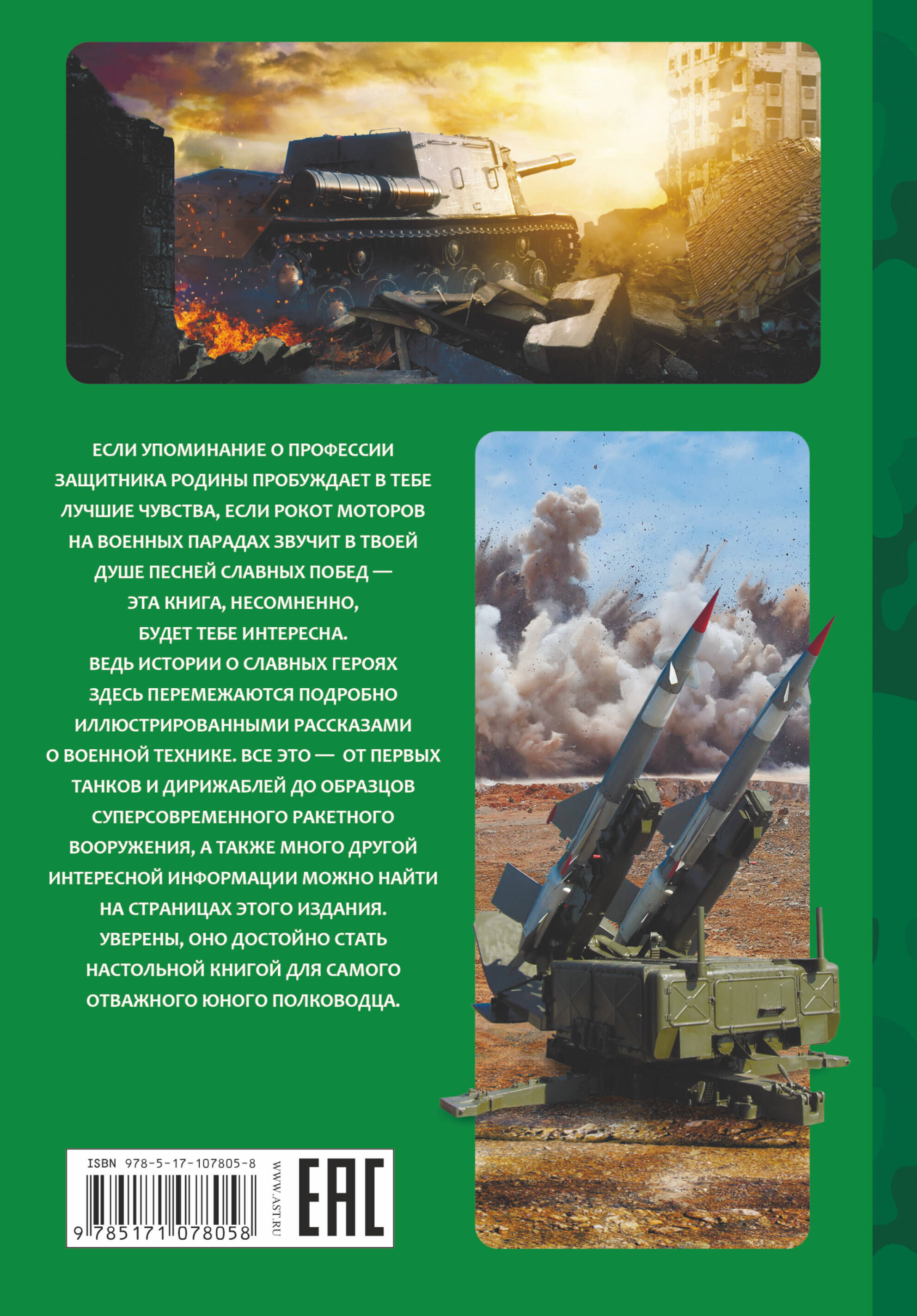 Если упоминание о профессии защитника Родины пробуждает в тебе лучшие чувства, если рокот моторов на военных парадах звучит в твоей душе песней славных побед - эта книга, несомненно, будет тебе интересна. Ведь истории о славных героях здесь перемежаются подробно иллюстрированными рассказами о военной технике. Все это - от первых танков и дирижаблей до образцов суперсовременного ракетного вооружения, а также много другой интересной информации, можно найти на страницах этого издания. Уверены, оно достойно стать настольной книгой для самого отважного юного полководца.| Издательство | ИЗДАТЕЛЬСТВО "АСТ" |