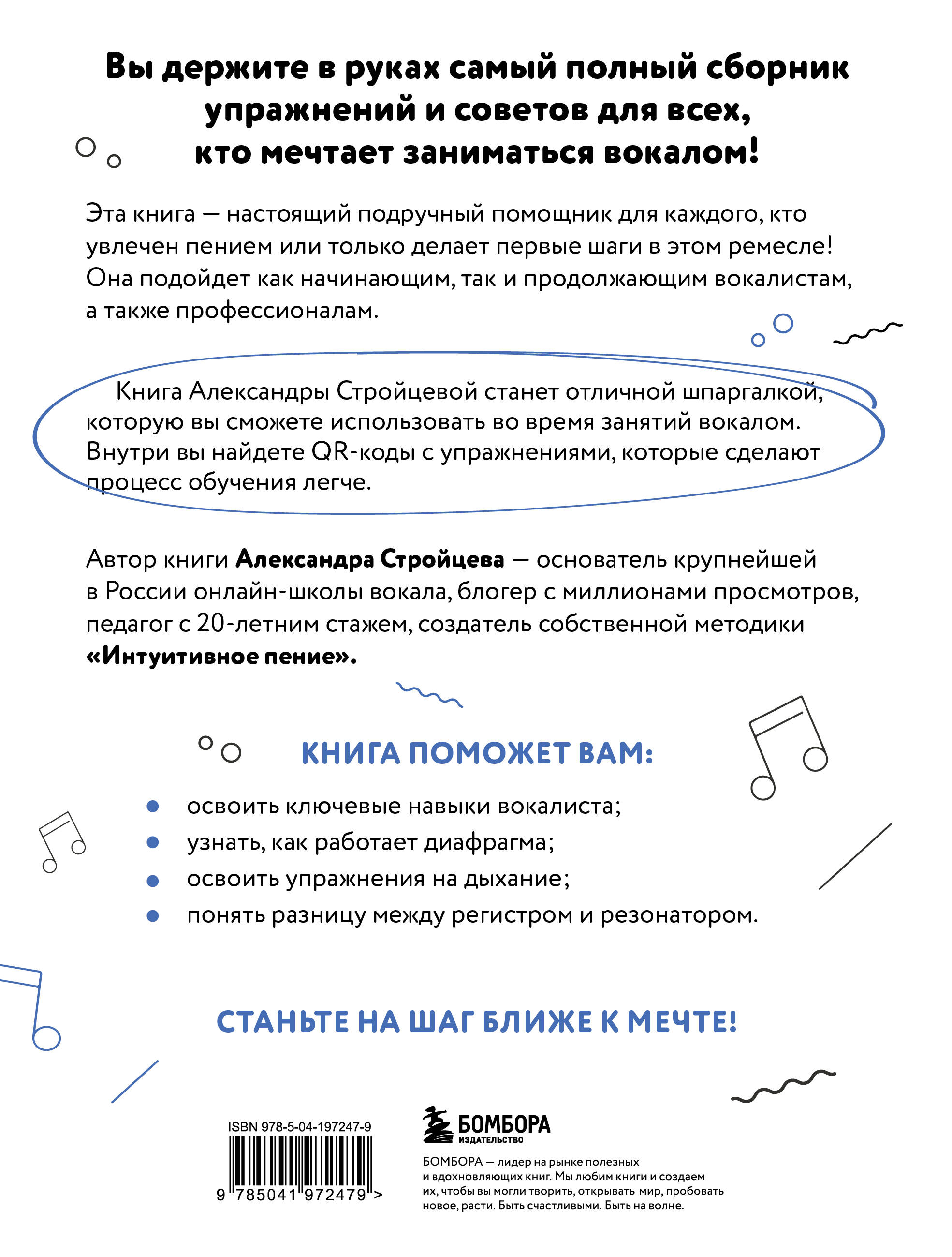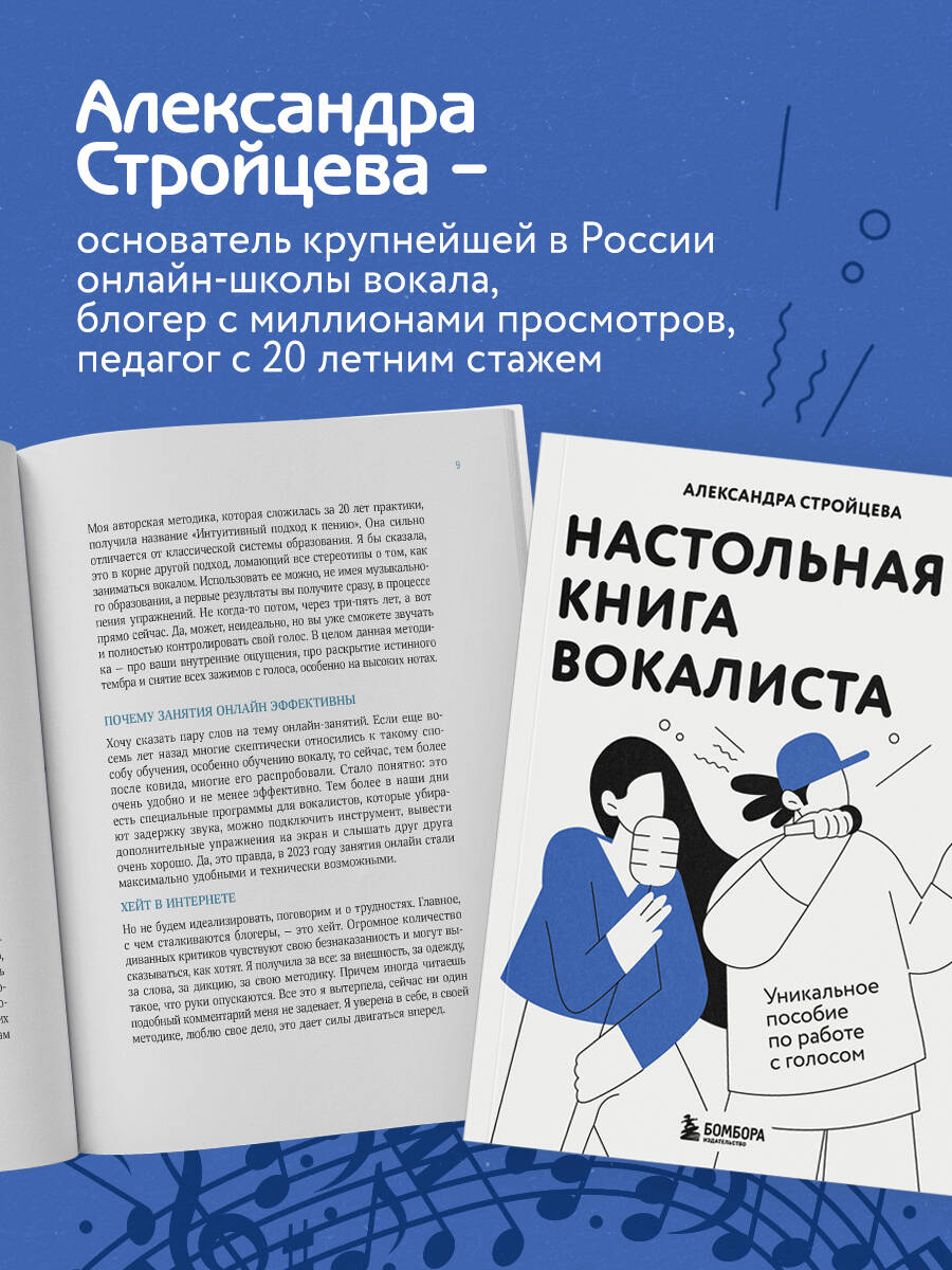 Эта книга - настоящий подручный помощник для каждого, кто увлечен пением или только делает первые шаги в этом ремесле! Она подойдёт как начинающим, так и продолжающим вокалистам, а также профессионалам. Книга Александры Стройцевой станет отличной шпаргалкой, которую вы сможете использовать во время занятий вокалом. Внутри вы найдёте QR-коды с упражнениями, которые сделают процесс обучения легче. Автор книги - Александра Стройцева, основатель крупнейшей в России онлайн-школы вокала, блогер с миллионами просмотров, педагог с 20 летним стажем, создатель собственной методики «Интуитивное пение». Книга поможет вам: - Снять все зажимы с голоса. - Найти свой истинный тембр. - Научиться петь высокие ноты. - Освоить главные вокальные приемы. Станьте на шаг ближе к мечте!| Издательство | ООО "Издательство "Эксмо" |