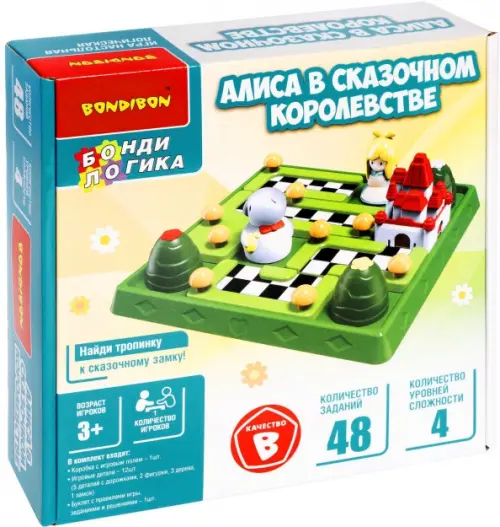 В комплекте игровое поле, 5 деталей с дорожками, фигурки кролика, Алисы, замок и 3 дерева. Игрушки ярких цветов выполнены из безопасных материалов!
