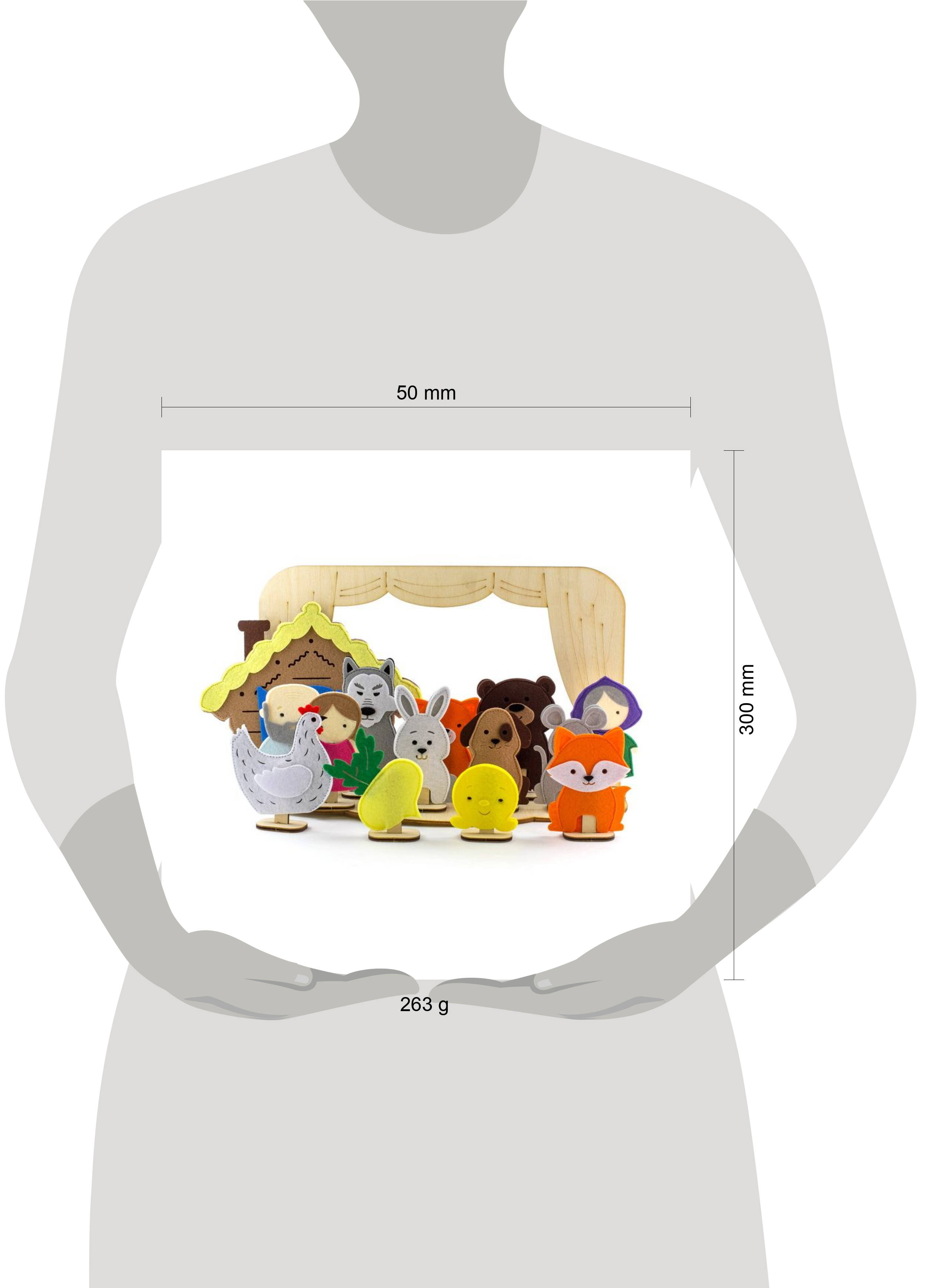 Настольный театр - это развивающая игрушка для театрализованных игр с детьми, который сочетает в себе кукольный, настольный и пальчиковый театры Развивающая игра "Настольный театр "3 в 1" подарит ребенку сказочный мир театрализованных игр и познакомит с замечательными персонажами любимых русских народных сказок "Репка", "Колобок", "Курочка Ряба". В наборе вы найдете сборную деревянную сцену, домик и героев всех трех сказок. Каждого персонажа можно установить на деревянные подставочки и расставить на деревянной сцене, надеть на пальчики ребенка и устроить театральную импровизацию или сюжетную игру вместе с домиком - декорацией. Игры с настольным театром полезны для развития мелкой моторики и координации движения ребенка. Яркие цвета, приятная текстура и интересное исполнение персонажей и декораций помогут в развитии памяти, мышления, зрительного и тактильного восприятия малыша. Для организации театрализованных игр с настольным театром прочитайте ребенку выбранную сказку и предложите разыграть действие на деревянной сцене с помощью соответствующих декораций и пальчиковых персонажей. Для разнообразия игр импровизируйте, придумывайте для героев новые имена, звуки, действия, дополняйте другими декорациями, используйте готовые детские сказки, стихотворения, песни. Удачных театральных экспериментов и сказочных импровизаций!