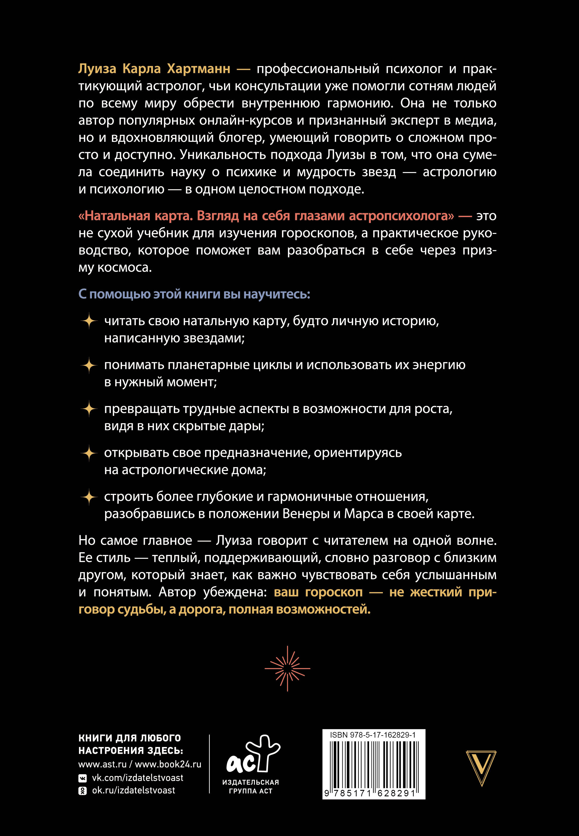 Луиза Карла Хартманн - профессиональный психолог и практикующий астролог, чьи консультации уже помогли сотням людей по всему миру обрести внутреннюю гармонию. Она не только автор популярных онлайн-курсов и признанный эксперт в медиа, но и вдохновляющий блогер, умеющий говорить о сложном просто и доступно. Уникальность подхода Луизы в том, что она сумела соединить науку о психике и мудрость звезд - астрологию и психологию - в одном целостном подходе. "Натальная карта. Взгляд на себя глазами астропсихолога" - это не сухой учебник для изучения гороскопов, а практическое руководство, которое поможет вам разобраться в себе через призму космоса. С помощью этой книги вы научитесь: • читать свою натальную карту, будто личную историю, написанную звездами; • понимать планетарные циклы и использовать их энергию в нужный момент; • превращать трудные аспекты в возможности для роста, видя в них скрытые дары; • открывать свое предназначение, ориентируясь на астрологические дома; • строить более глубокие и гармоничные отношения, разобравшись в положении Венеры и Марса в своей карте. Но самое главное - Луиза говорит с читателем на одной волне. Ее стиль - теплый, поддерживающий, словно разговор с близким другом, который знает, как важно чувствовать себя услышанным и понятым. Автор убеждена: ваш гороскоп - не жесткий приговор судьбы, а дорога, полная возможностей| Издательство | Издательство "АСТ" |
