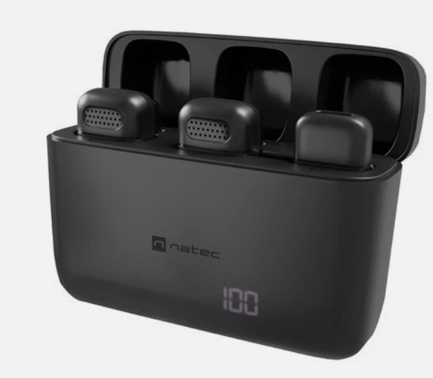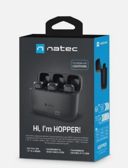 Natec Hopper Black (NMI‑2256) компактный беспроводной гарнитурный микрофон‑набор для смартфонов с разъёмом Lightning. Идеально подходит для интервью, видеоблогов и репортажей благодаря стабильной работе на расстоянии до 30 м и технологии подавления фонового шума (ENC).