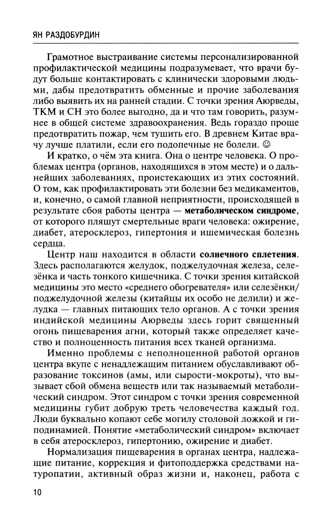 Лишний вес, повышенный сахар в крови, давление и другие сосудистые проблемы - это наиболее распространённые жалобы пациентов старше 40 лет. Что делать, если постоянно преследуют слабость и усталость? Как надолго снизить лишний вес? Как предотвратить переход преддиабета в диабет? Как укрепить сосуды и стабилизировать давление? Методика, разработанная доктором-специалистом традиционной и нетрадиционной медицины Яном Раздобурдиным, охватывает широкий круг вопросов по оздоровлению последствий метаболического синдрома: ожирения, диабета, жирового гепатоза и атеросклероза. Всемирная организация здравоохранения считает эти заболевания главными врагами человечества за последнюю сотню лет. Взяв лучшее от трёх медицинских подходов, автор увлекательно и доступно рассказывает о том, что вызывает эти состояния, как их предупредить и как минимизировать последствия для здоровья с помощью Аюрведы, традиционной китайской медицины и современной нутрициологии. Эта книга будет полезна как ищущему врачу, так и обычному человеку, который хочет разобраться в причинах своего недомогания. Автор предлагает невероятно действенную смесь натуральных средств древней и современной медицины, а также рекомендации по питанию и образу жизни, которые легко понять и применить на практике.| Издательство | Центрполиграф |