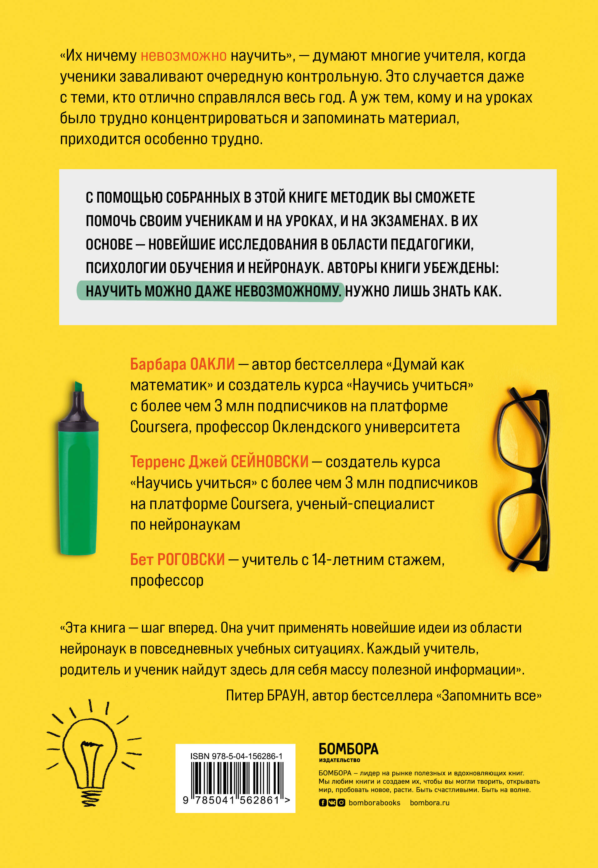 Любой ученик может показывать отличные результаты, - убеждена Барбара Оакли. Но как помочь ученикам их достичь? Ведь они сталкиваются с массой трудностей: нехватка концентрации, экзаменационный стресс, изменения в программе, потеря интереса к предмету. Авторы этой книги объединили последние исследования в области педагогики, психологии обучения и нейронаук. На стыке этих дисциплин они разработали методики, эффективность которых доказал их курс "Научись учиться". Сегодня его аудитория на Coursera превышает 3 млн человек. Методики, собранные в книге, помогут вашим ученикам: - запоминать большие объемы новой информации; - не бояться экзаменов; - преодолеть прокрастинацию; Учителям книга поможет: - поддерживать вовлеченность учеников; - заинтересовать даже тех, кто не отрывается от телефона; - сделать свой класс сплоченной и дружной командой.| Издательство | Эксмо |