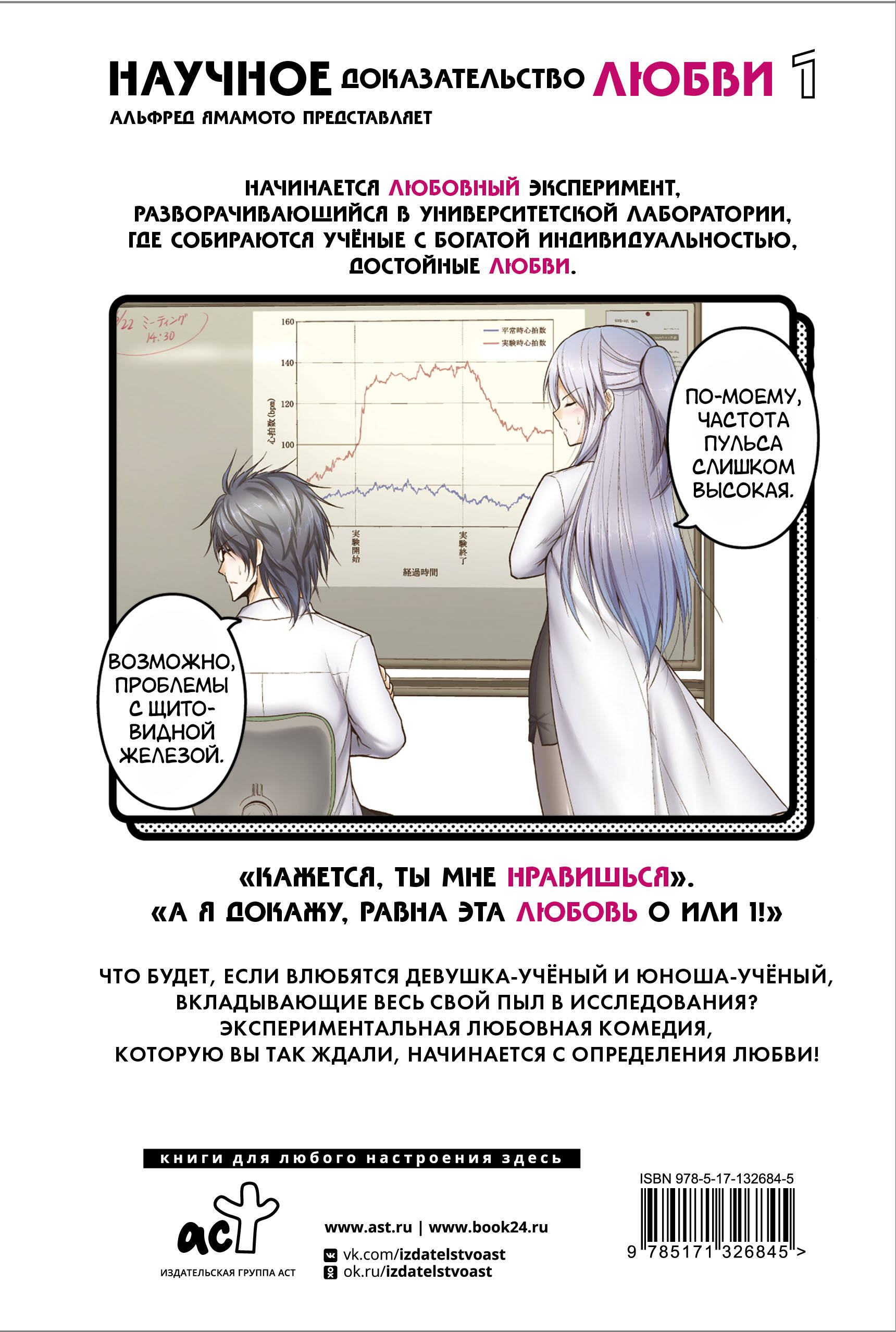 Начинается любовный эксперимент, разворачивающийся в университетской лаборатории, где собираются учёные с богатой индивидуальностью, достойные любви! Романтичная манга, в которой парочка юных ученых хочет выяснить, может ли чувство влюбленности быть описано через науку. Учащиеся магистратуры Юкимура и его коллега Химуро, ученые от мозга до костей, они испытывают друг к другу особенное чувство, но просто принимать расплывчатую формулировку «влюбленность» они не собираются! Сначала ее нужно доказать! Экспериментальные свидания, измерение настроения, измерение сердечного давления, пульса и многое другое - всё ради неоспоримых доказательств! Все это автор преподносит с нотками юмора и романтики. Поэтому комедийных моментов в манге не мало. Так же в книге дозированно выдается разного рода полезная информация. Научные термины, эксперименты, явления и способы познания окружающего и себя. Взгляни на свои чувства иначе, вместе с серией манги «Научное доказательство любви»!| Издательство | ИЗДАТЕЛЬСТВО "АСТ" |