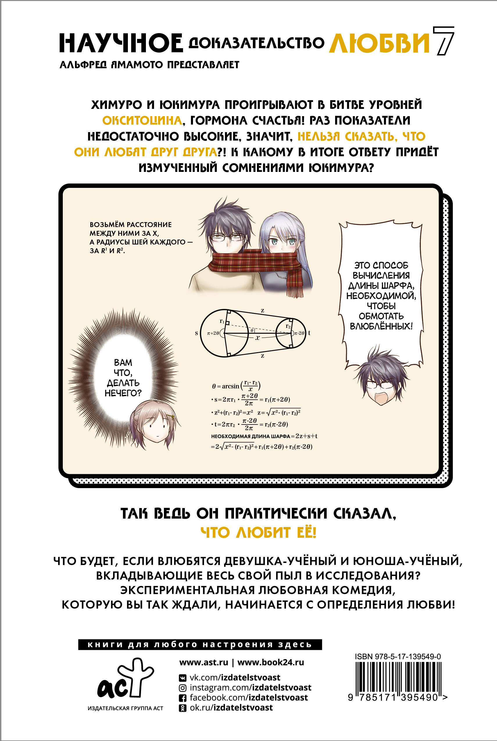 Продолжается любовный эксперимент, разворачивающийся в университетской лаборатории, где собираются учёные с богатой индивидуальностью, достойные любви! Романтичная манга, в которой парочка юных ученых хочет выяснить, может ли чувство влюбленности быть описано через науку. Учащиеся магистратуры Юкимура и его коллега Химуро, ученые от мозга до костей, они испытывают друг к другу особенное чувство, но просто принимать расплывчатую формулировку «влюбленность» они не собираются! Сначала ее нужно доказать! Экспериментальные свидания, измерение настроения, измерение сердечного давления, пульса и многое другое - всё ради неоспоримых доказательств! Все это автор преподносит с нотками юмора и романтики. Поэтому комедийных моментов в манге не мало. Так же в книге дозированно выдается разного рода полезная информация. Научные термины, эксперименты, явления и способы познания окружающего и себя. Взгляни на свои чувства иначе, вместе с серией манги «Научное доказательство любви»!| Издательство | ИЗДАТЕЛЬСТВО "АСТ" |