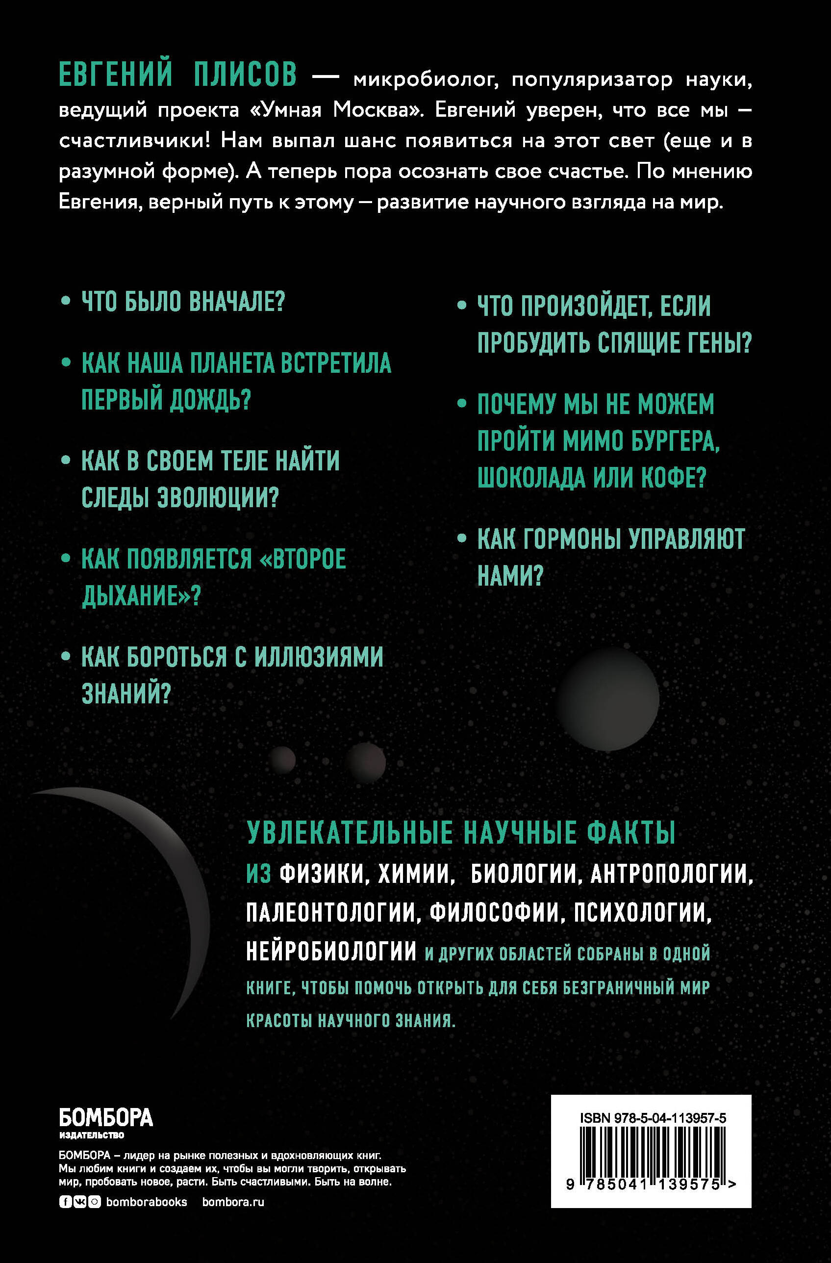 Каковы шансы родиться умными существами? Вероятность, мягко говоря, небольшая. Но «бинго!» - вы здесь, в этом мире, Вселенной, Галактике. Евгений Плисов, микробиолог, популяризатор науки, ведущий проекта «Умная Москва», уверен, что этот «счастливый билет» нужно использовать по максимуму. Как это сделать? Начать смотреть на мир не только под обывательским углом, но и научным. Разобраться в том, как устроен человек и мир в целом. Для этого автор книги собрал в одном издании важные и интересные факты из физики, палеонтологии, биологии, химии, нейробиологии и даже психологии и философии. Сперва вы окажетесь в начале начал. Затем полежите на первых бело-кристаллических пляжах молодого океана. Одновременно с этим будете наблюдать за сверкающими своими твердыми глазами трилобитами. В какой-то момент вас затянет в черную дыру, а затем и в торговый центр, где вы не сможете пройти мимо кофе или бургеров. Почему мир такой, какой он есть? Как работает наш организм? Для чего нужно смотреть на мир с разных точек зрения? И как научиться наслаждаться жизнью в полной мере?| Издательство | ООО "Издательство "Эксмо" |