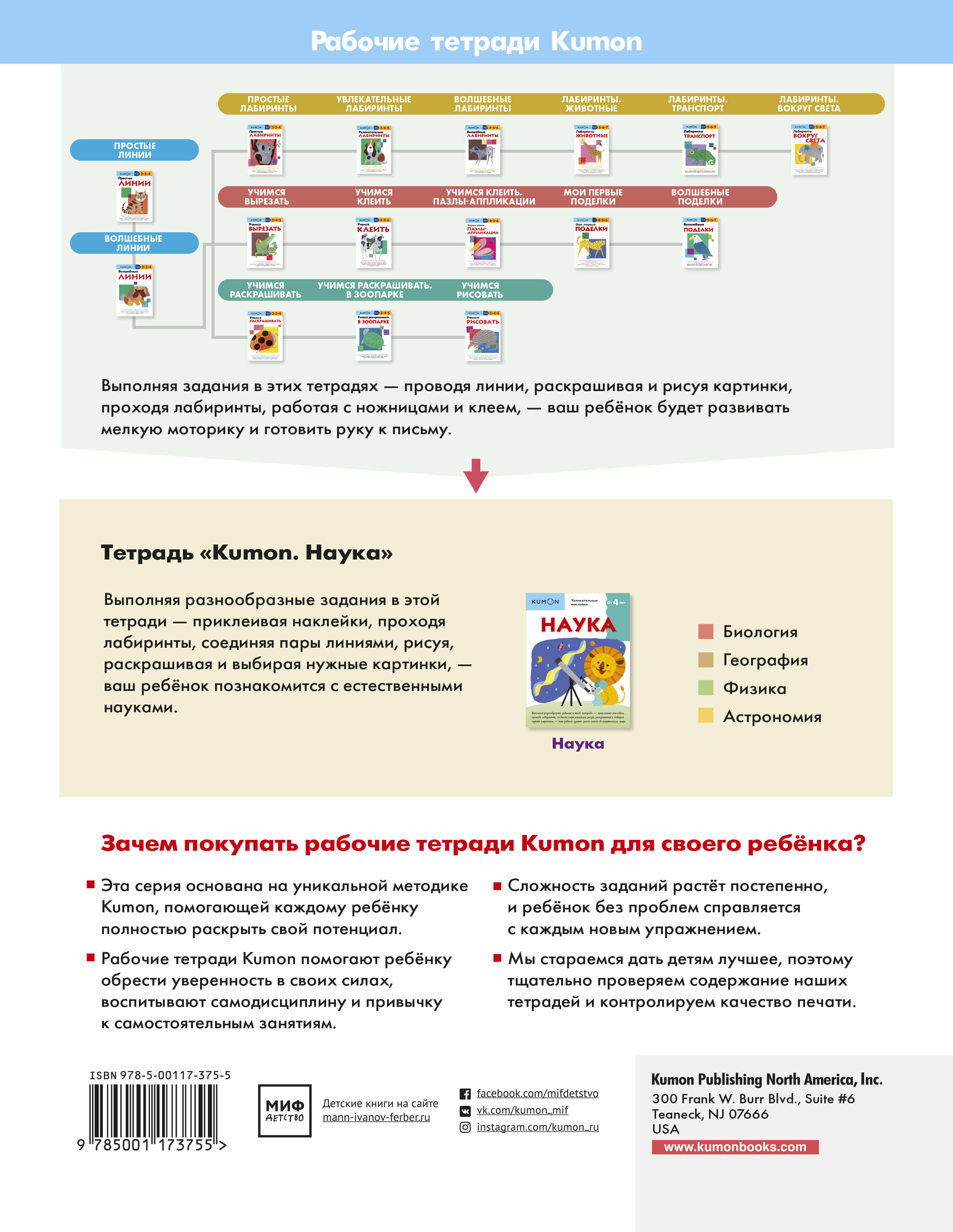 Вместе с тетрадью "Наука" ваш ребенок познакомится с основами таких естественных наук как: биология, география, физика и астрономия. Интересные разнообразные задания помогут расширить кругозор и привить интерес к учению, а работа с карандашом и наклейками будут способствовать развитию мелкой моторики рук.| Издательство | Манн, Иванов и Фербер |