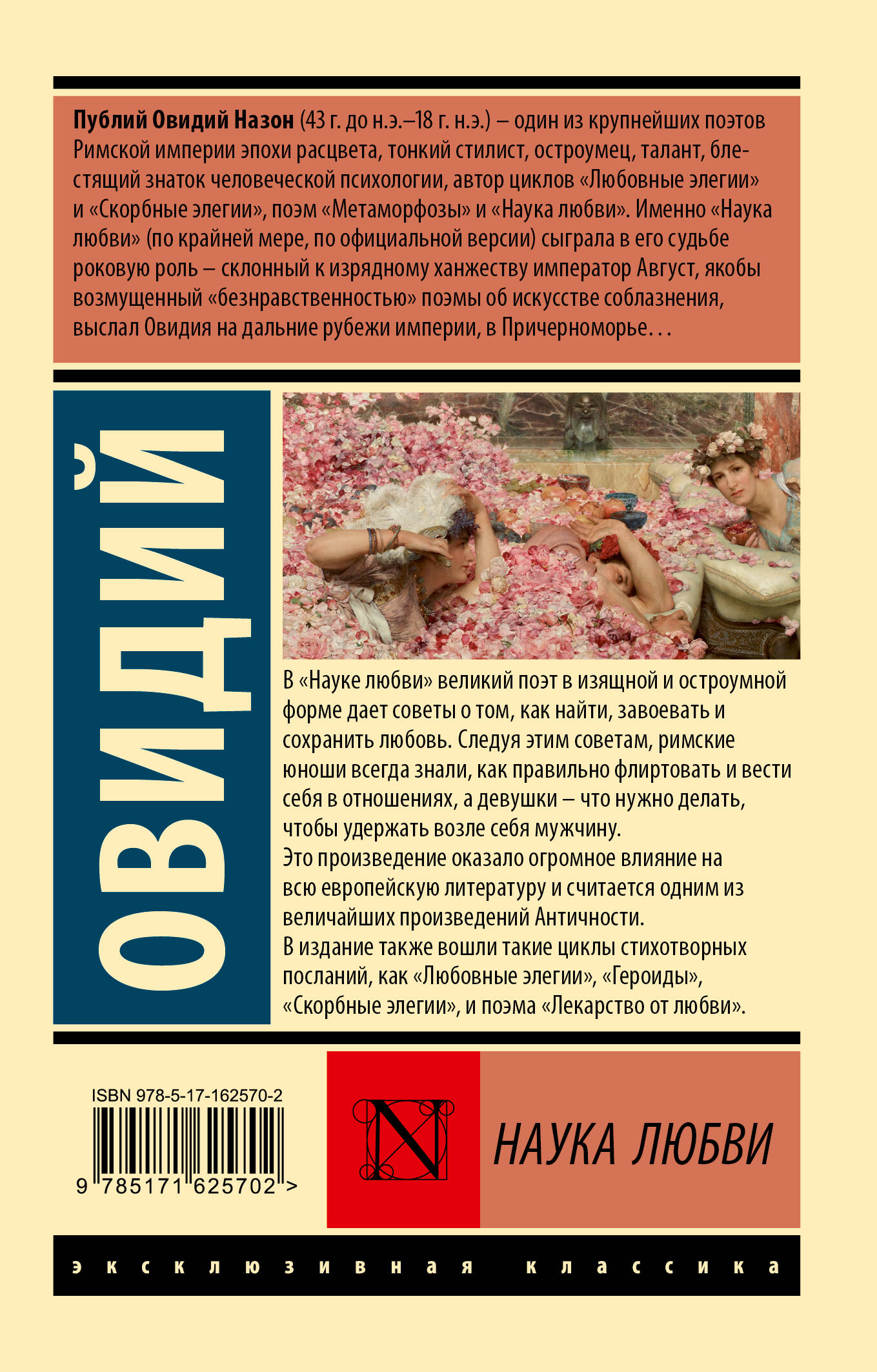 В "Науке любви" великий поэт в изящной и остроумной форме дает советы о том, как найти, завоевать и сохранить любовь. Следуя этим советам, римские юноши всегда знали, как правильно флиртовать и вести себя в отношениях, а девушки - что нужно делать, чтобы удержать возле себя мужчину. Это произведение оказало огромное влияние на всю европейскую литературу и считается одним из величайших произведений Античности. В издание также вошли такие циклы стихотворных посланий, как "Любовные элегии", "Героиды", "Скорбные элегии", и поэма "Лекарство от любви".| Издательство | Издательство "АСТ" |