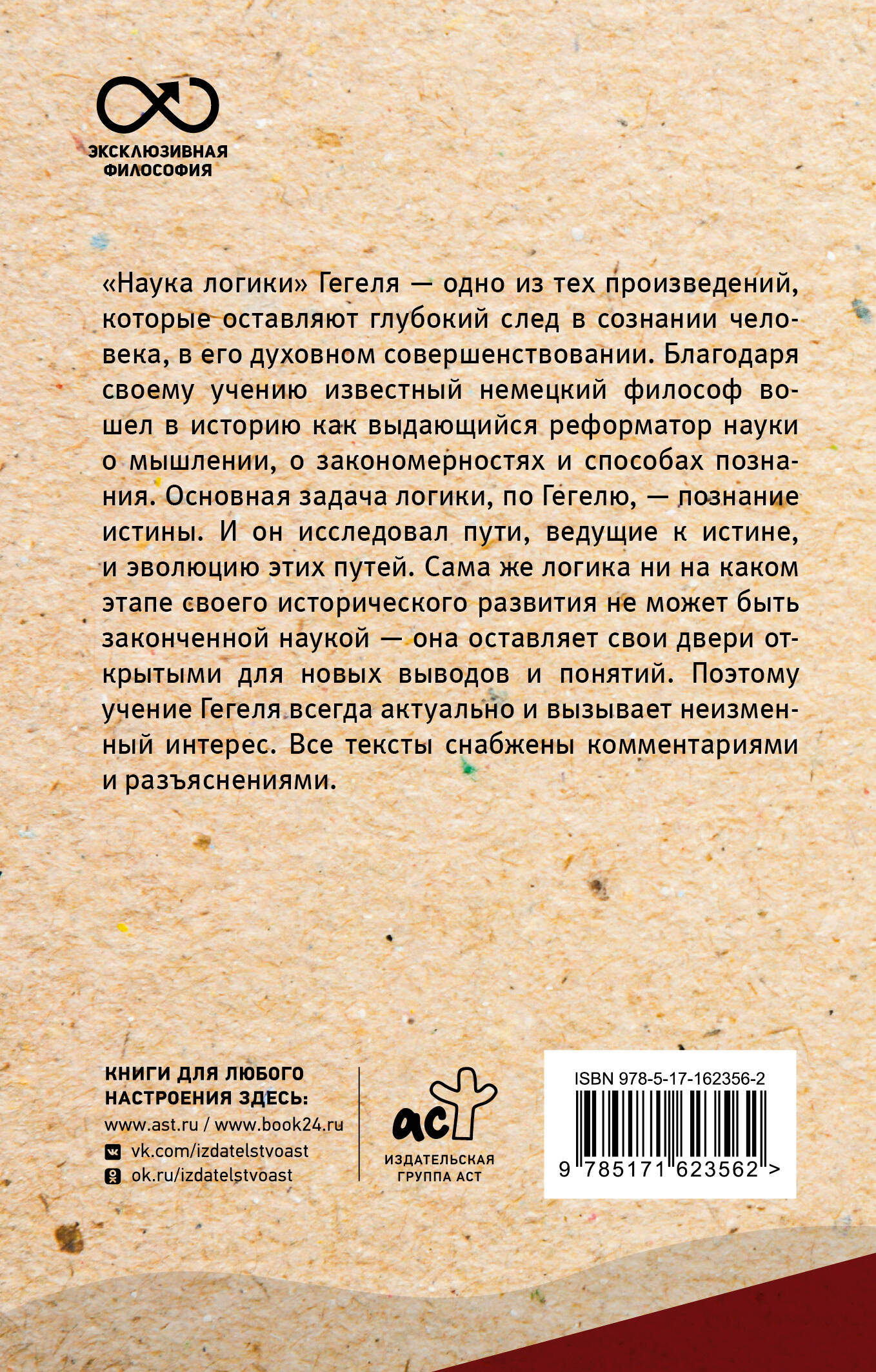 "Наука логики" Гегеля - одно из тех произведений, которые остав- ляют глубокий след в сознании человека, в его духовном совершен- ствовании. Благодаря своему учению известный немецкий философ вошел в историю как выдающийся реформатор науки о мышлении, о закономерностях и способах познания. Основная задача логики, по Гегелю, - познание истины. И он исследовал пути, ведущие к ис- тине, и эволюцию этих путей. Сама же логика ни на каком этапе свое- го исторического развития не может быть законченной наукой - она оставляет свои двери открытыми для новых выводов и понятий. Поэ- тому учение Гегеля всегда актуально и вызывает неизменный интерес. Все тексты снабжены комментариями и разъяснениями.| Издательство | Издательство "АСТ" |