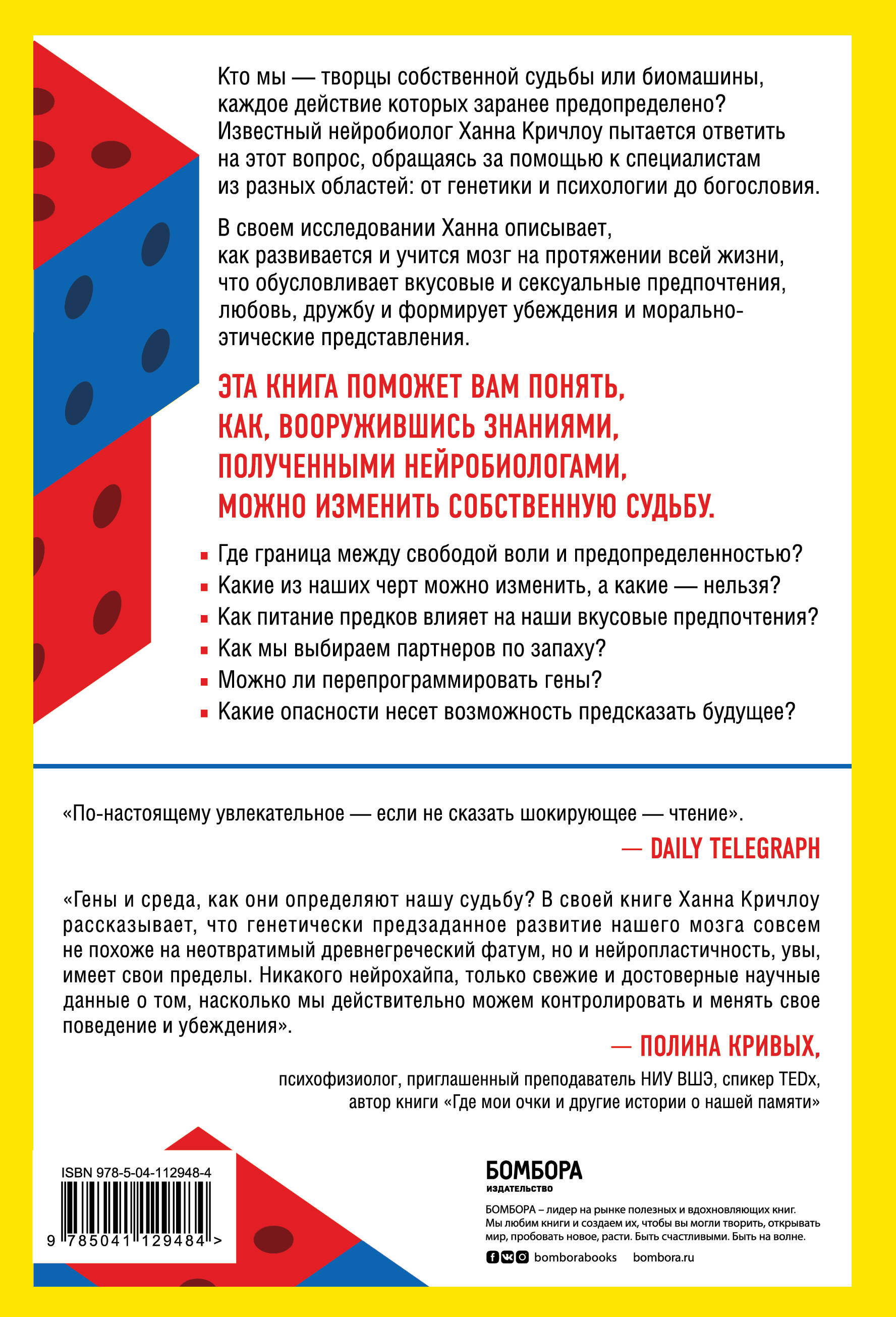 «Нам продают концепцию абсолютной субъектности и беспредельных возможностей, мечты о таблетке для свободной воли, которая снимет все биологические и социально-экономические ограничения. Однако с нейробиологической точки зрения лозунг "Будь тем, кем тебе хочется" не очень убедителен». - Хана Кричлоу. Исследования нейробиологов дали человечеству возможность по-новому взглянуть на такие привычные понятия, как «судьба» и «предопределенность». Ученые выяснили, что наше поведение, вкусовые пристрастия, выбор друзей и партнёров во многом обусловлены строением нашего мозга. Есть ли в таком случае в нашей жизни место свободе воли? Можем ли мы изменить то, что заложено в нас с рождения? Какие опасности несёт в себе возможность предсказывать будущее на основе исследований мозга? На все эти вопросы в своём исследовании отвечает известный нейробиолог из Великобритании Хана Кричлоу. Она описывает, как развивается и учится мозг на протяжении всей жизни, что обуславливает индивидуальные предпочтения, на основе чего строятся человеческие взаимоотношения и формируются убеждения и морально-этические представления. Для создания полной картины Хана обращается за помощью специалистов из разных областей: от генетики и психологии до богословия. Эта книга поможет вам понять, как, вооружившись знаниями, полученными нейробиологами, можно изменить собственную судьбу.| Издательство | ООО "Издательство "Эксмо" |