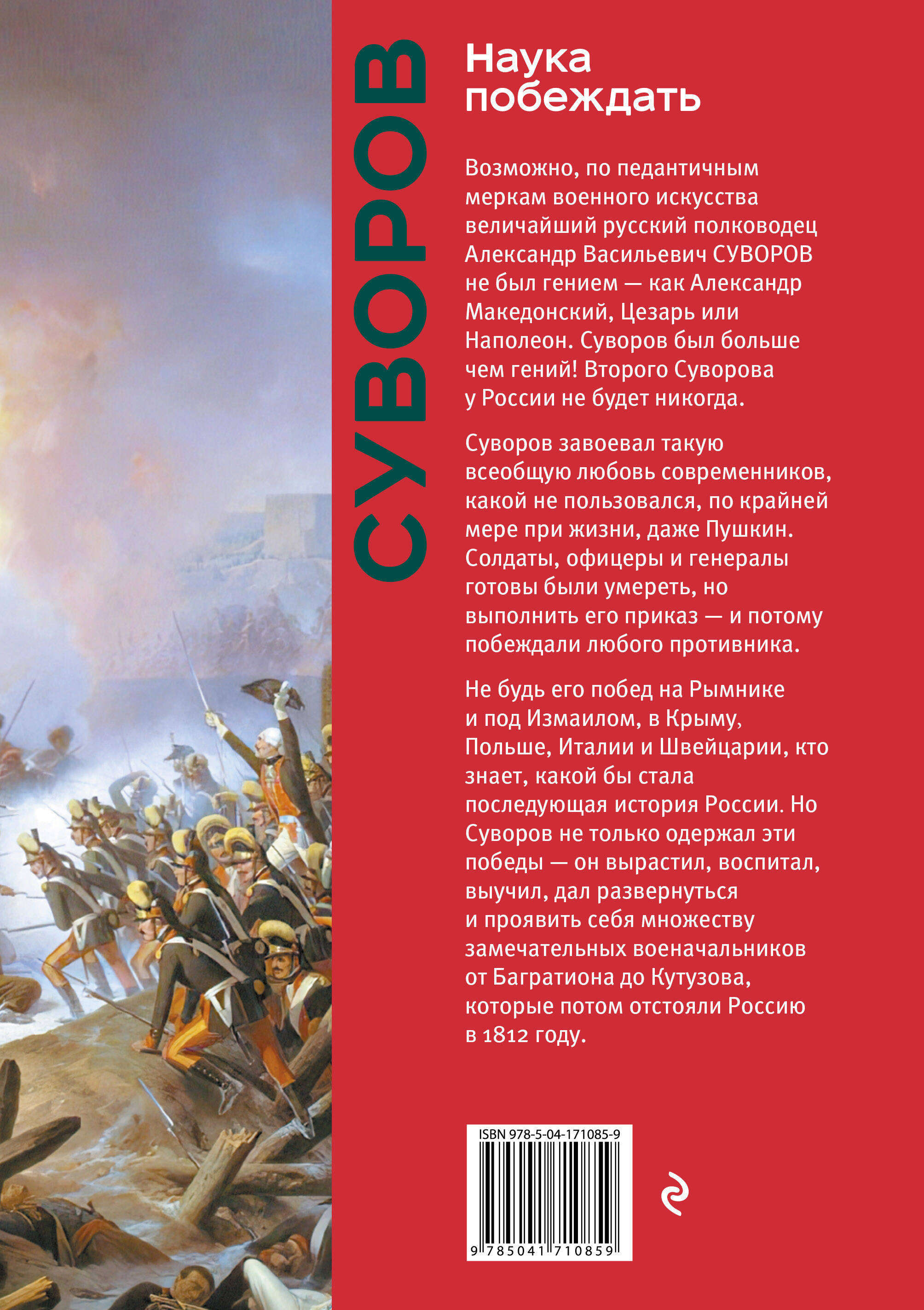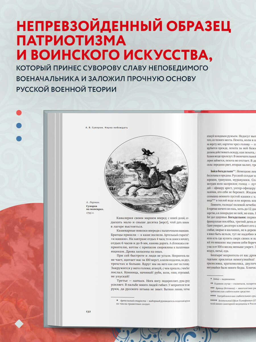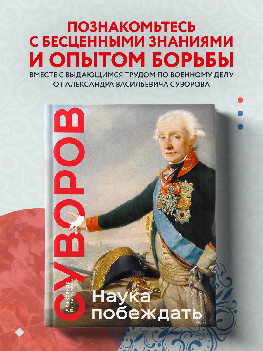 «Наука побеждать» - выдающийся труд по военному делу, написанный одним из самых любимых и почитаемых русских полководцев - Александром Васильевичем Суворовым. Эта книга вместила в себя бесценные знания и опыт, которые принесли А. В. Суворову славу непобедимого военачальника и заложили прочную основу русской военной теории. О серии «Книга побед» - коллекционная серия подарочных иллюстрированных книг, объединившая фигуры легендарных исторических личностей, которые внесли каждый свой вклад в искусство побеждать. Издания, вошедшие в серию, посвящены не только премудростям военной науки, тактике, стратегии, но и воспитанию духа, воли и качеств настоящего лидера, необходимых для победы. Собеседниками и учителями выступают легендарные полководцы, мыслители, государственные деятели. Каждая книга серии выполнена в уникальном дизайне с удлиненным форзацем, имитирующим печать на обрезе, и сопровождена большим количеством цветных и черно-белых иллюстраций, которые позволяют полнее проникнуться духом славной эпохи и лучше усвоить уроки великих. Серия в качественном полиграфическом исполнении станет настоящим украшением домашней и деловой библиотеки истинных книголюбов и собирателей редких книг, достойным подарком близким и бизнес-партнерам, а также ценным источником для всех, кто интересуется военной историей и ее ключевыми фигурами, историей государственного управления, ролью личности в истории.| Издательство | ООО "Издательство "Эксмо" |