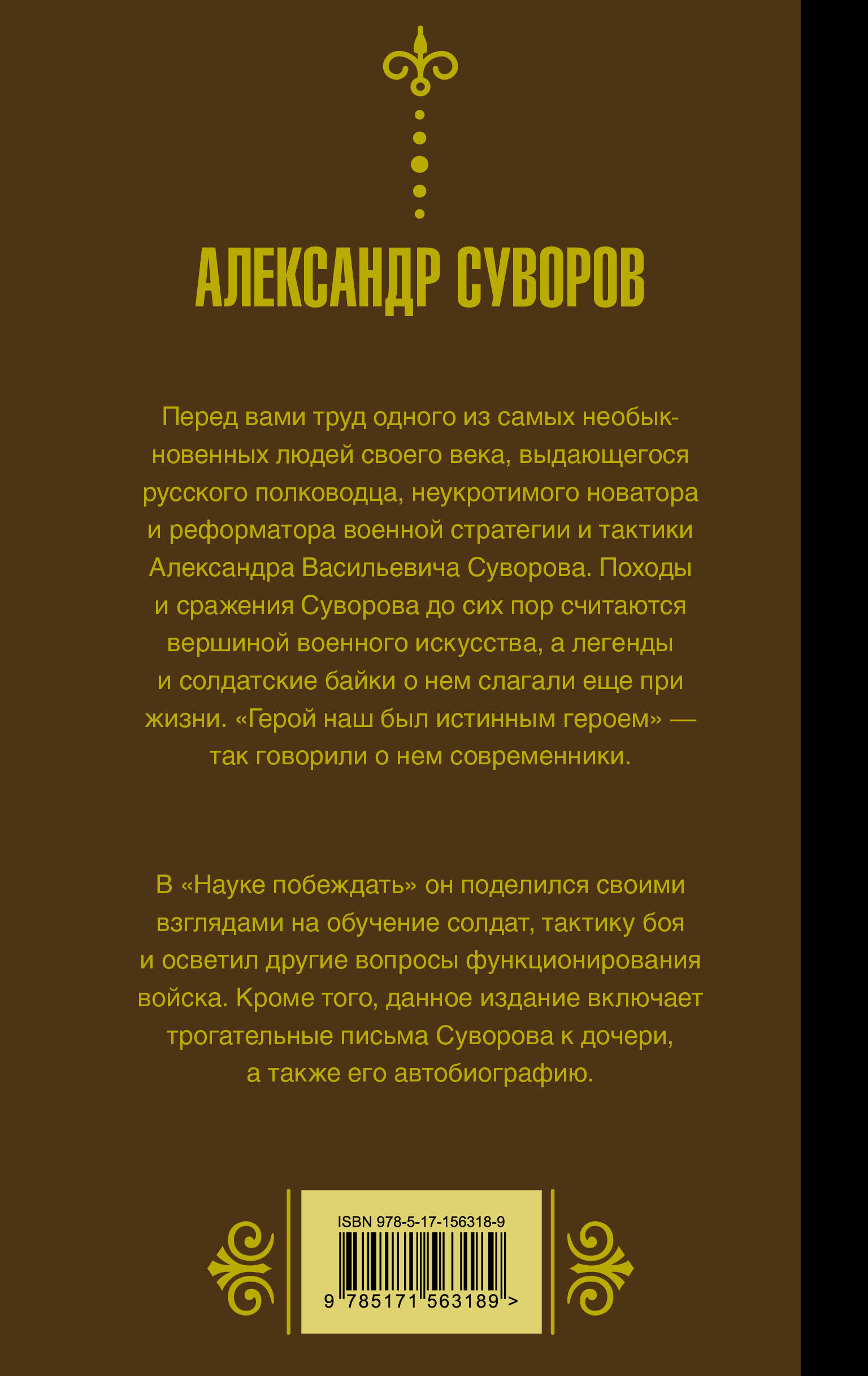 Перед вами труд одного из самых необыкновенных людей своего века, выдающегося русского полководца, неукротимого новатора и реформатора военной стратегии и тактики Александра Васильевича Суворова. Походы и сражения Суворова до сих пор считаются вершиной военного искусства, а легенды и солдатские байки о нем слагали ещё при жизни. "Герой наш был истинным героем", - так говорили о нем современники… В "Науке побеждать" он поделился своими взглядами на обучение солдат, тактику боя и осветил другие вопросы функционирования войска. Кроме того, данное издание включает в себя трогательные письма Суворова к своей дочери, а также его автобиографию.| Издательство | ИЗДАТЕЛЬСТВО "АСТ" |
