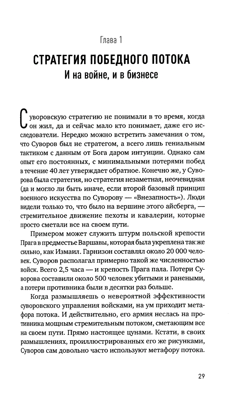 Автор предлагает уникальную методику обучения руководителей, основанную на принципах прославленного русского полководца А.В. Суворова. По его мнению, на базе суворовской «Науки побеждать» можно создать в компании новую управленческую и деловую культуру, тесно связанную с национальными корнями, а значит, более стабильную и устойчивую к внешним воздействиям. Глазомер (адекватная оценка ситуации), быстрота и натиск, умение, задействовав небольшую группу людей, выполнять грандиозные задачи, обучение действием - вот основные принципы, которые позволили Суворову в течение 40 лет выигрывать все свои сражения и которые применимы в условиях поведенческих моделей современного руководителя. Выводы автора подкрепляются примерами из современной российской бизнес-практики.| Издательство | Альпина Паблишер |
