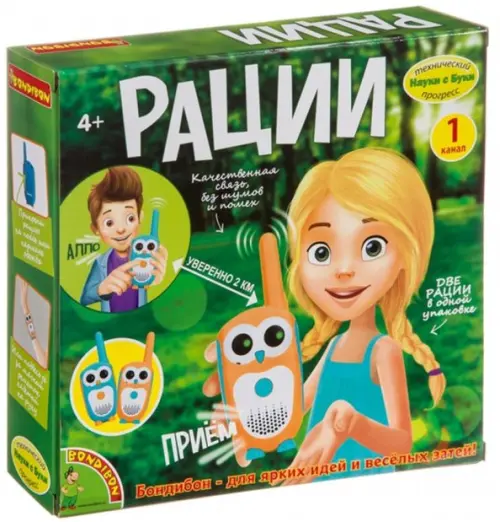 В наборе: 2 одноканальные рации в виде милых совят, радиус действия которых 2 км.