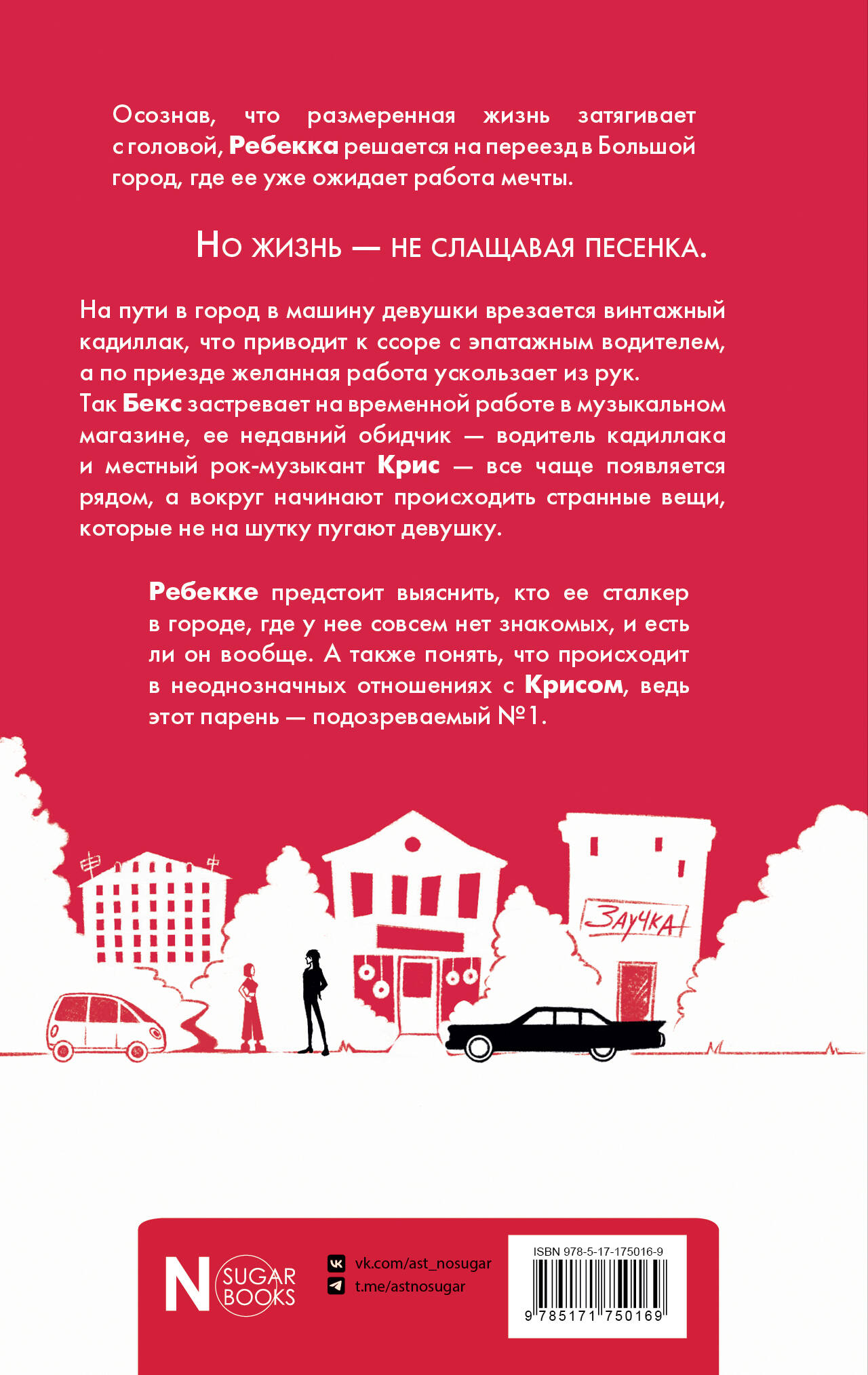 Осознав, что размеренная жизнь затягивает с головой, Ребекка решается на переезд в Большой город, где ее уже ожидает работа мечты. Но жизнь - не слащавая песенка. На пути в город в машину девушки врезается винтажный кадиллак, что приводит к ссоре с эпатажным водителем, а по приезде желанная работа ускользает из рук. Так Бекс застревает на временной работе в музыкальном магазине, ее недавний обидчик - водитель кадиллака и местный рок-музыкант Крис - все чаще появляется рядом, а вокруг начинают происходить странные вещи, которые не на шутку пугают девушку. Ребекке предстоит выяснить, кто ее сталкер в городе, где у нее совсем нет знакомых, и есть ли он вообще. А также понять, что происходит в неоднозначных отношениях с Крисом, ведь этот парень - подозреваемый №1.| Издательство | Издательство "АСТ" |